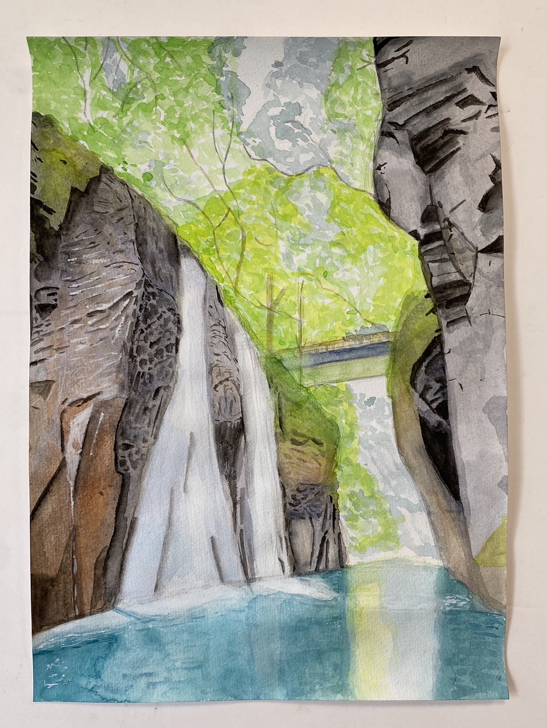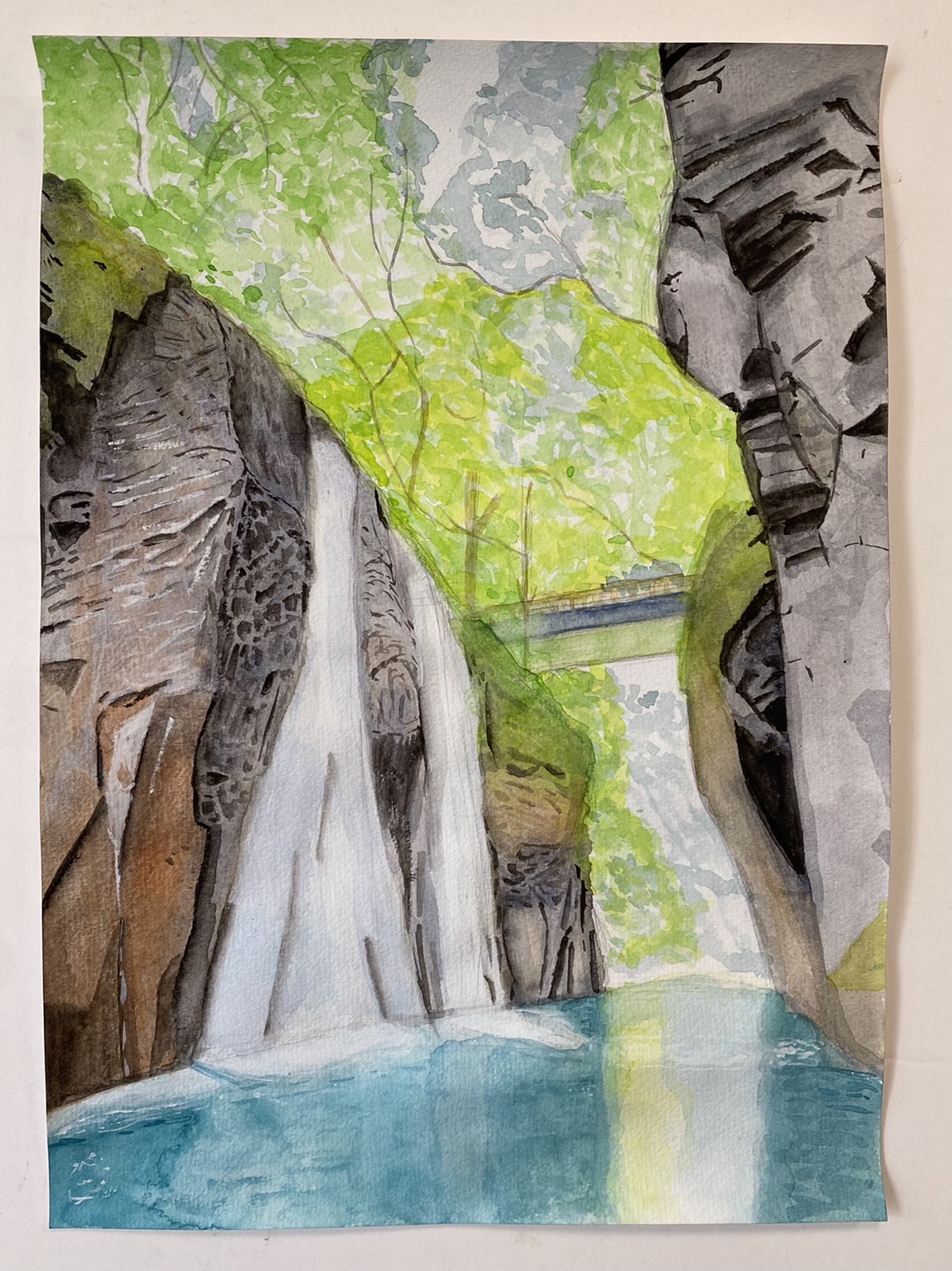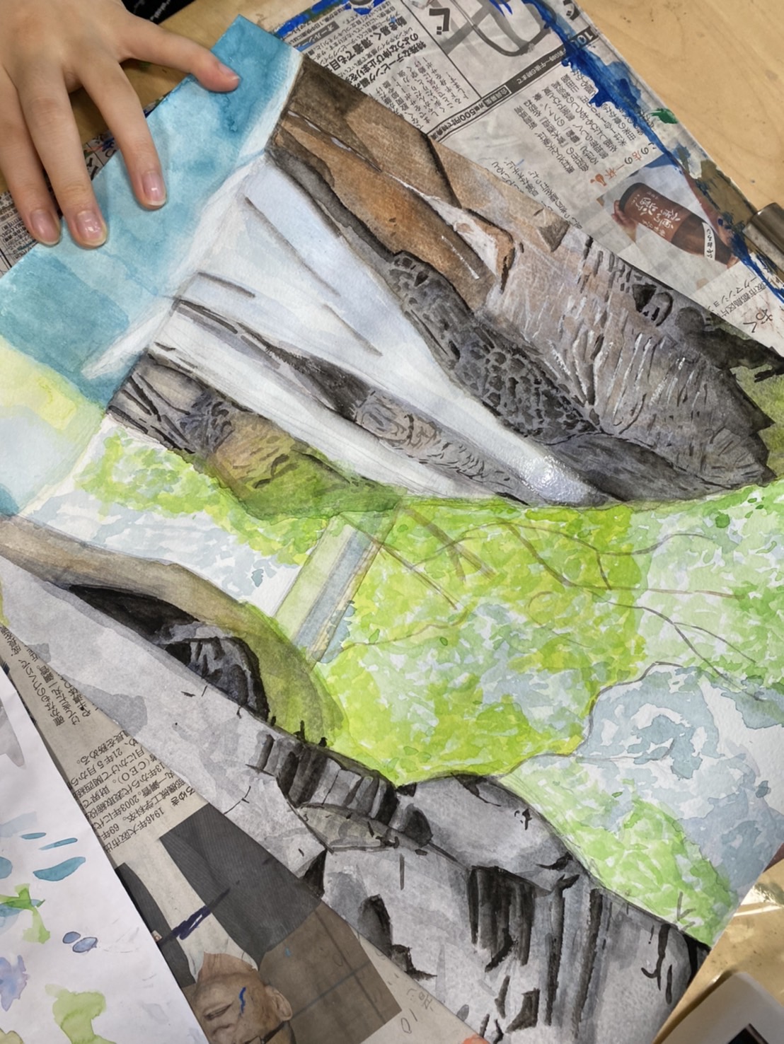 水の明るさを出しながら、全体をよく見て着彩をバランスよく進めていました。また岩の描写など、濃い色もしっかりのせてメリハリをつけることも発見したようで、自分でどんどん描く感覚を磨いていますね。