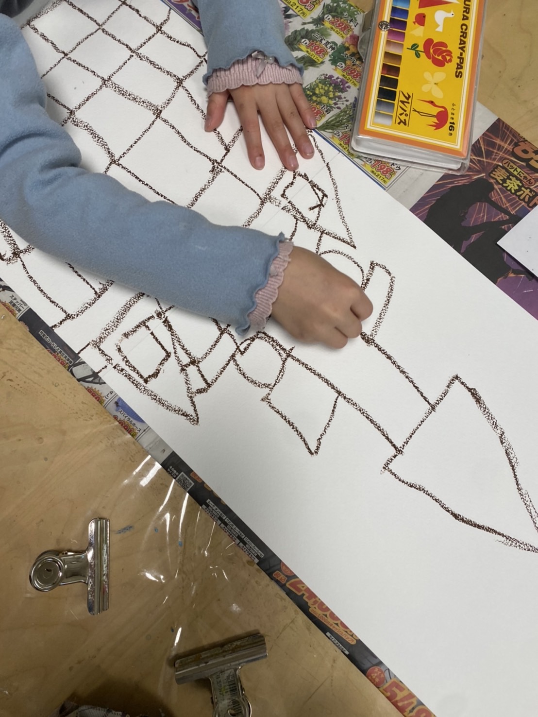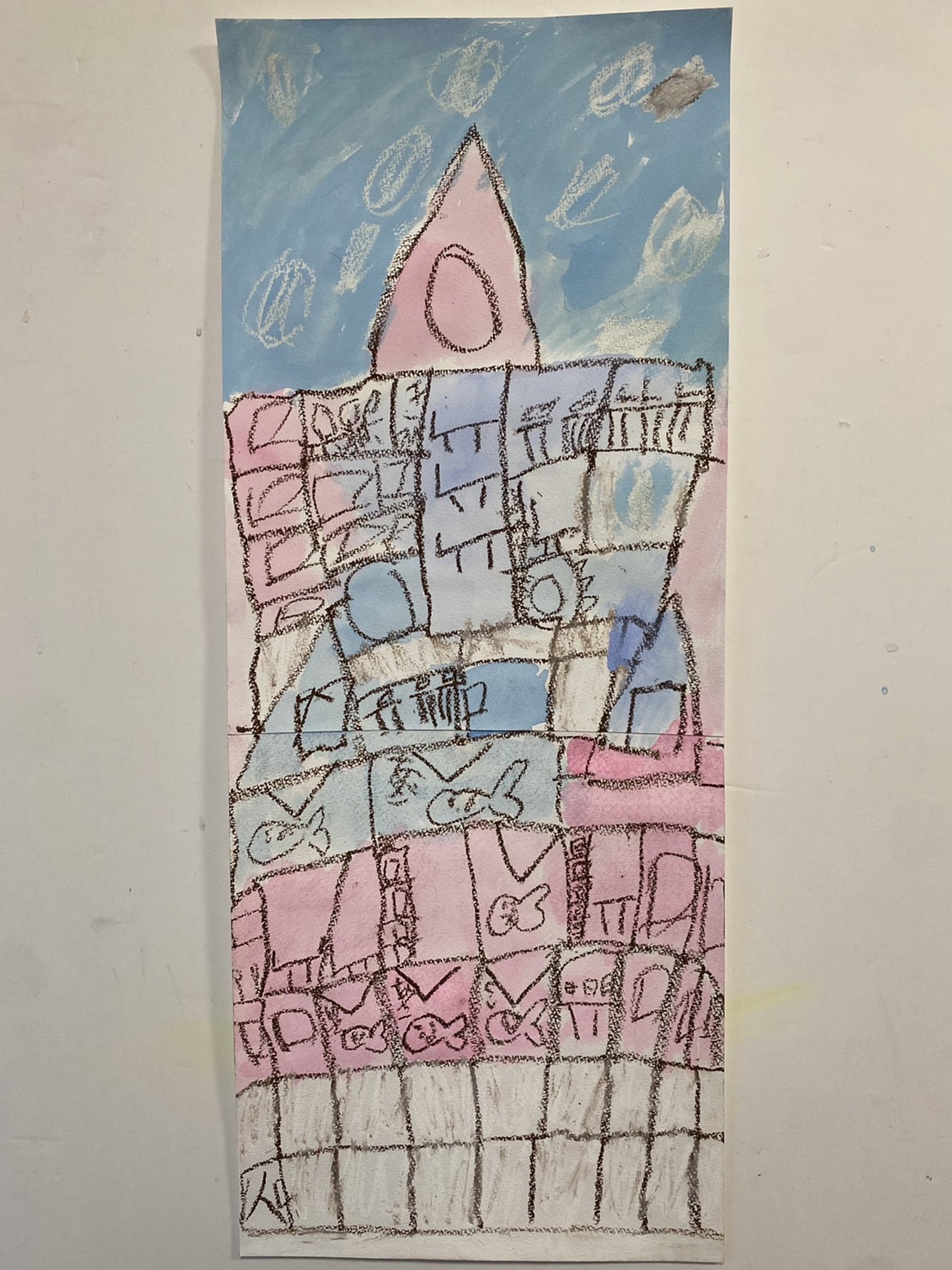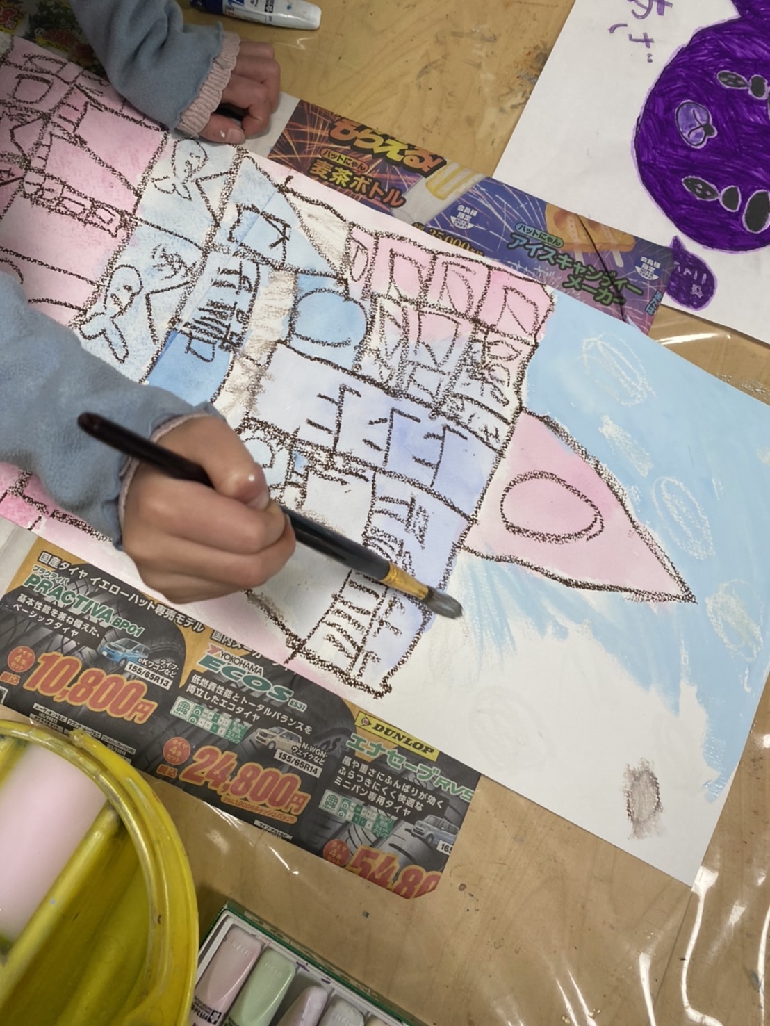 そして、つみきタワーを描こうでは、はじき絵をベースに、クレパスの線で形を描き、水彩絵の具で着彩をして描きました。