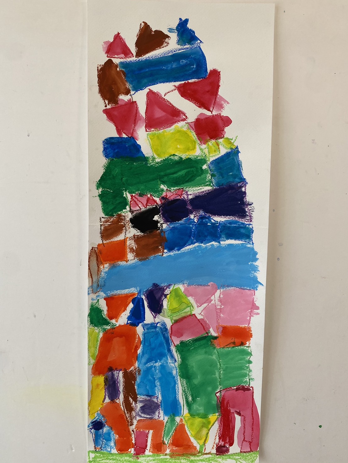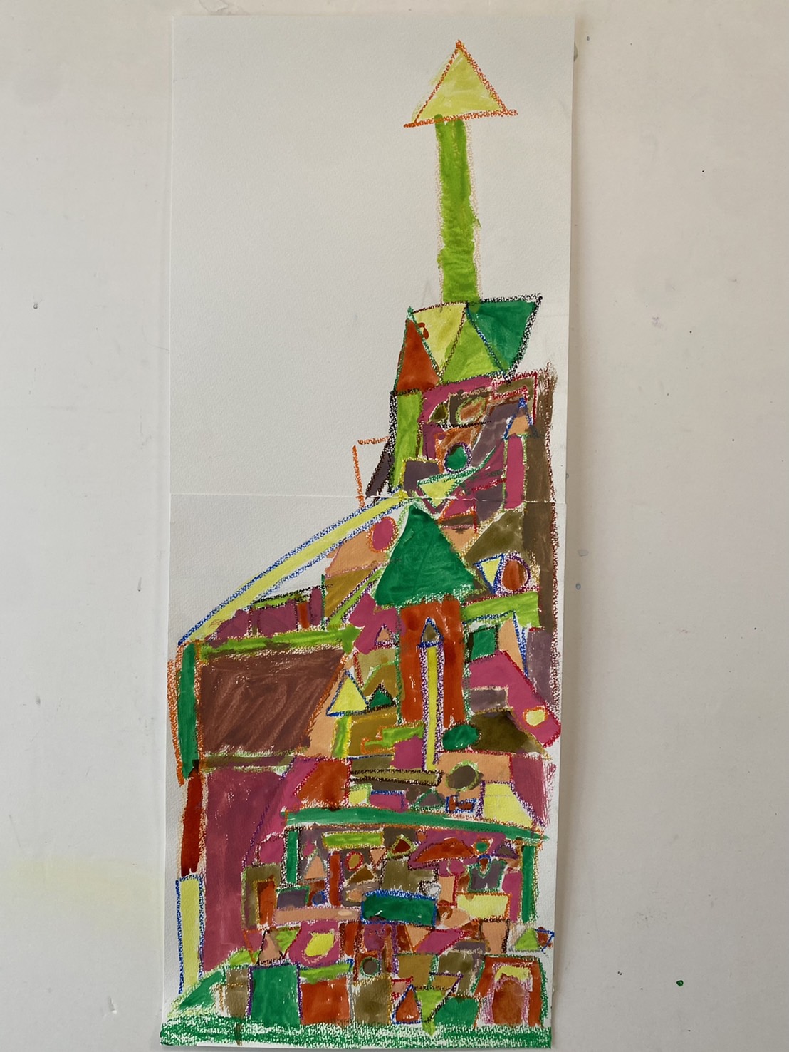 こちらの生徒さんは、四角をベースに、大きい形、小さい形を組み合わせてどっしりとしたタワーを描きました。