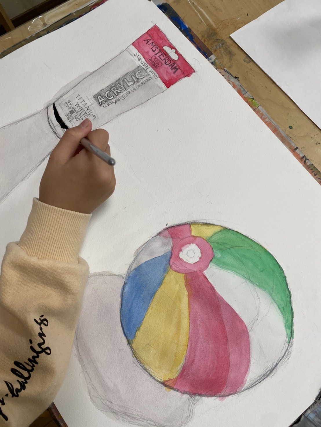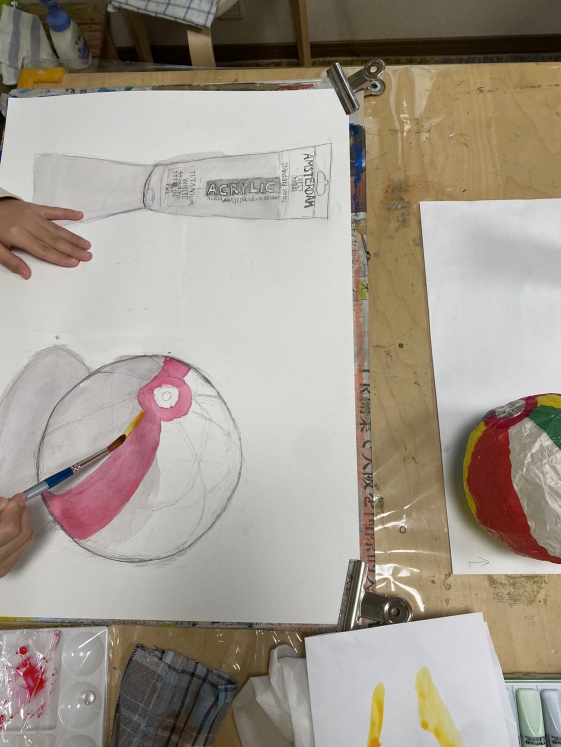 そして、観察画は、固有色を置いています。紙風船のそれぞれの色のかたちをよく見て描くことで、球の形が出てきます。