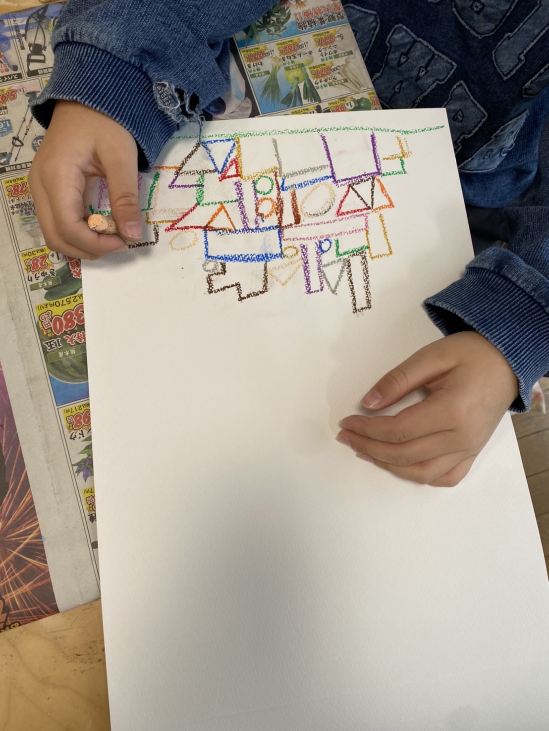 つみきタワーでは、つみきのように、いろんな形を積み上げて、オリジナルのタワーを描いていきました。