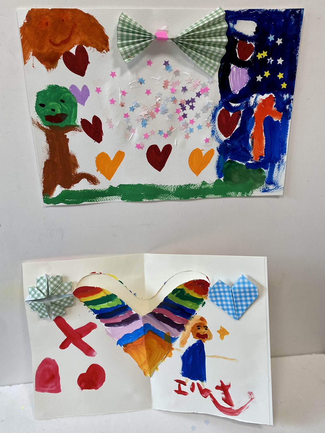 朝、お昼、夜を描いてたハートの絵も作りました。星がいっぱいでキラキラ素敵ですね!走っている木が面白いとのことです!