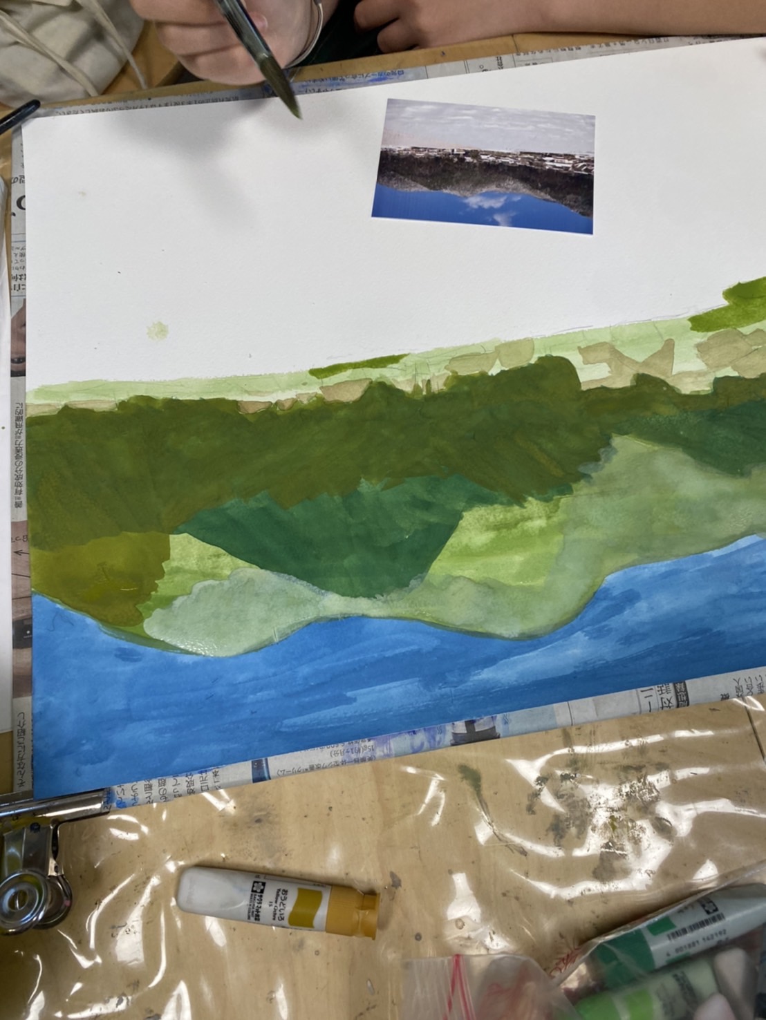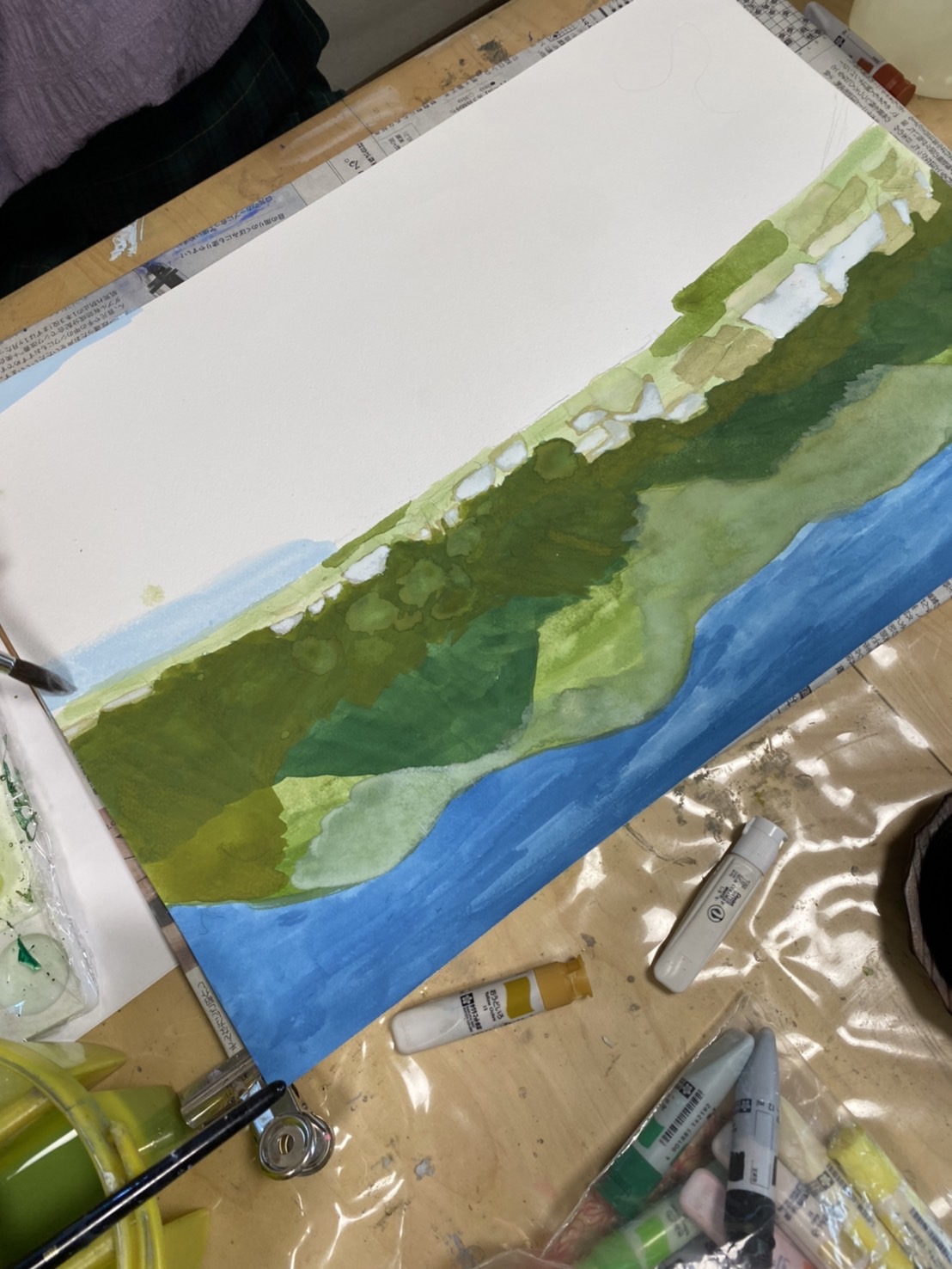 そして、風景画は、雪が積もった山と町並みですが、山の緑が夏のように青かったので、もう少し彩度を落とした緑色を作ってぬりかさねたり、手前の雪も少し青味を持った白で平らな面を意識して大きく描きました。