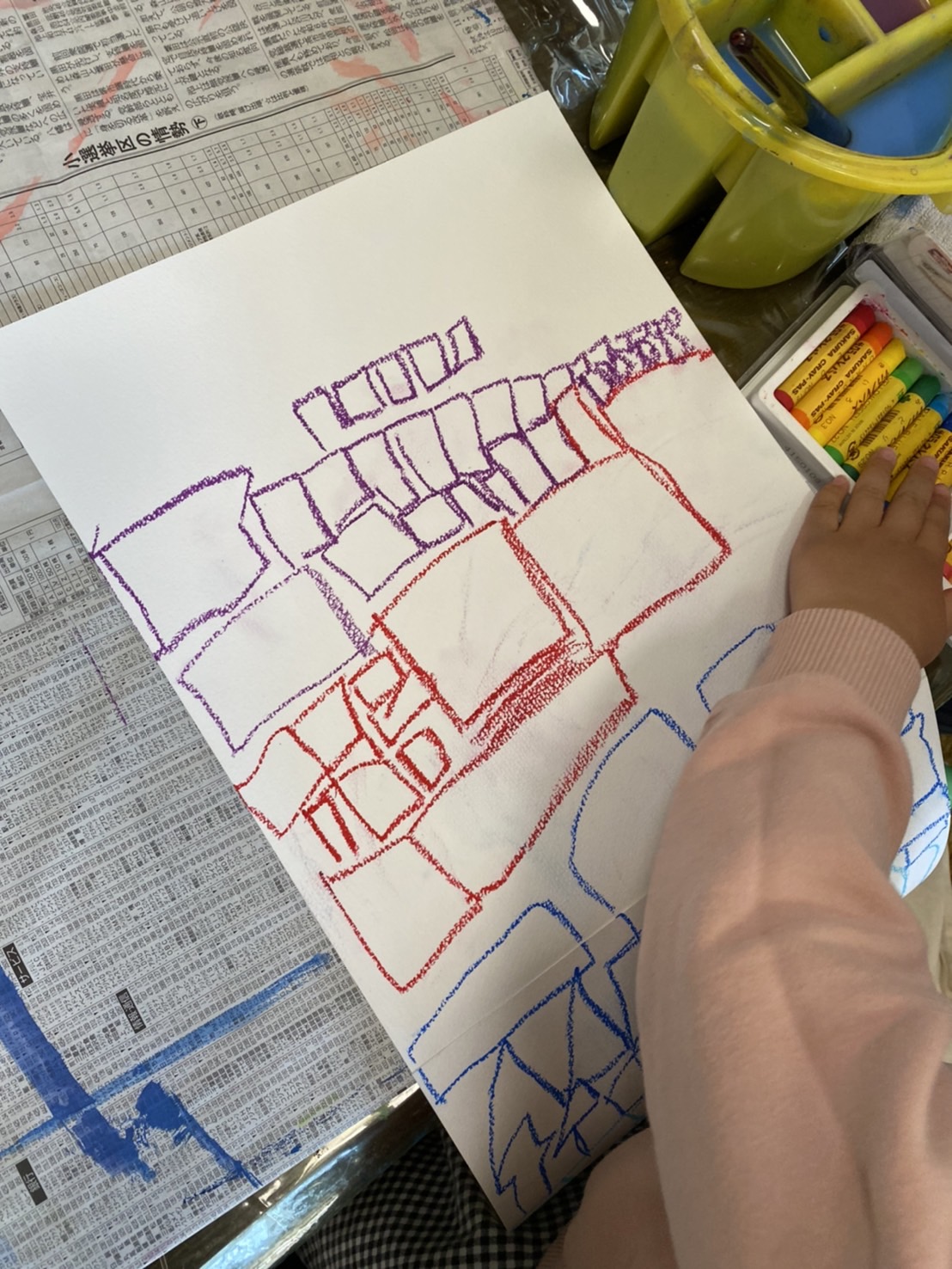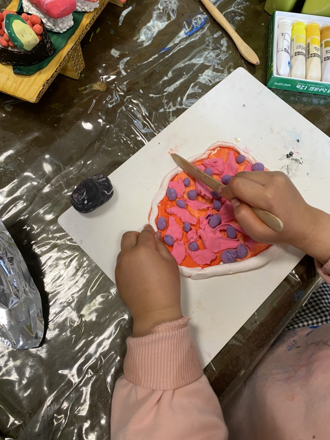 クレパスのタワーも描いたり、ねんどでピザも作ったり、がんばっていろんなことにチャレンジしていました。
