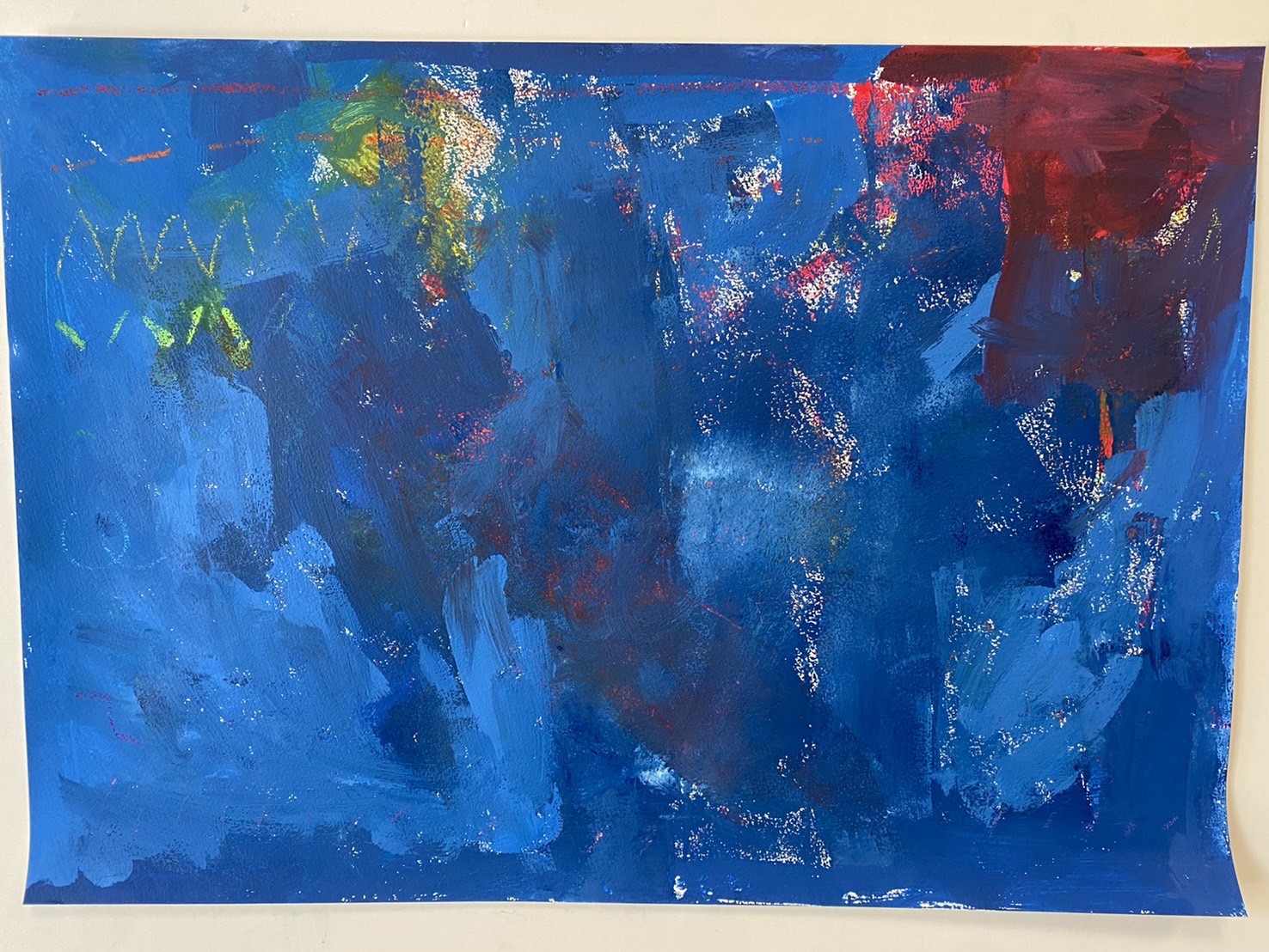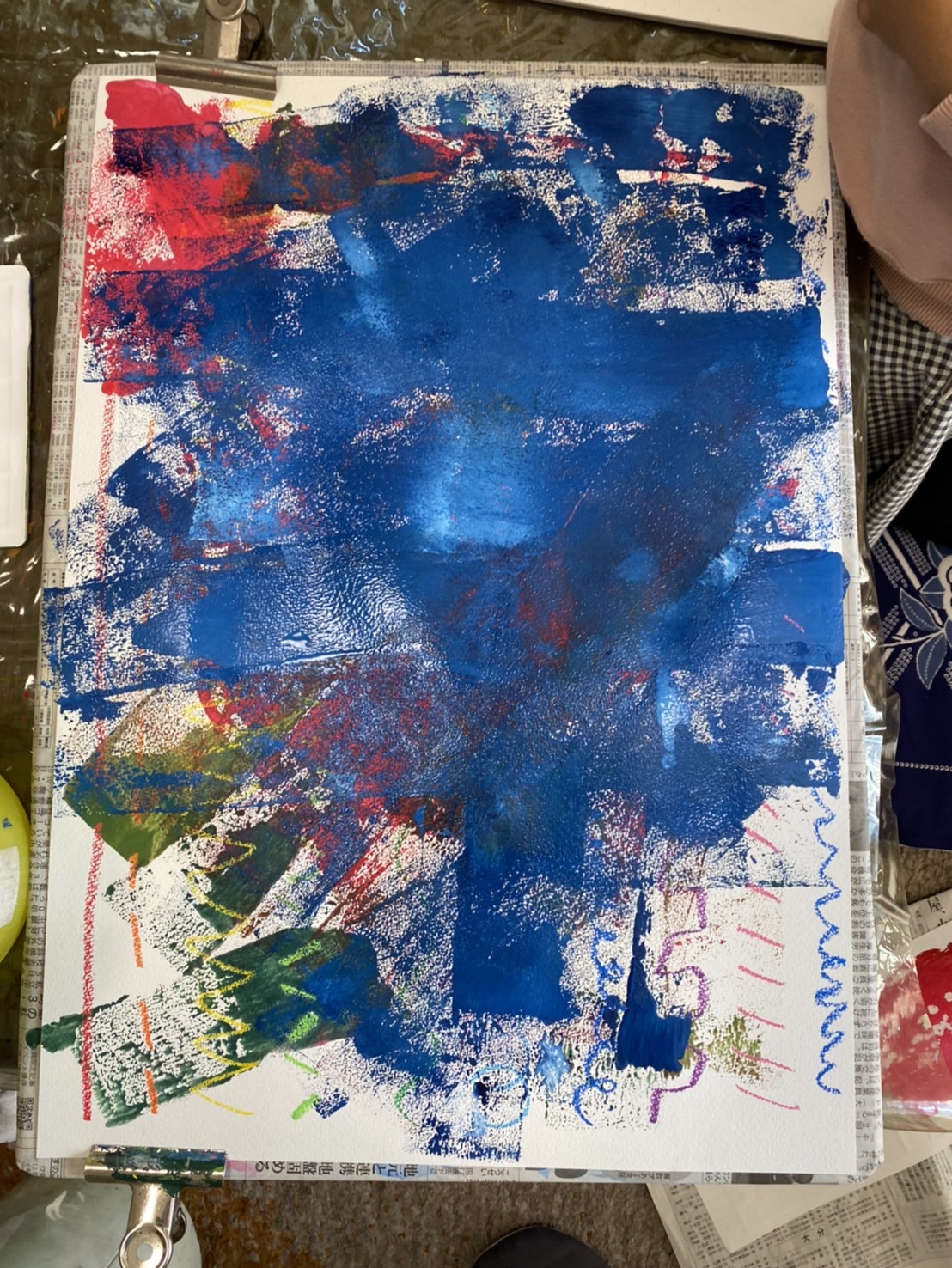 青を重ねて塗って、絵の具の層が出来て、複雑な青の広がりがあらわれましたね!アクセントのピンクもきれいです。