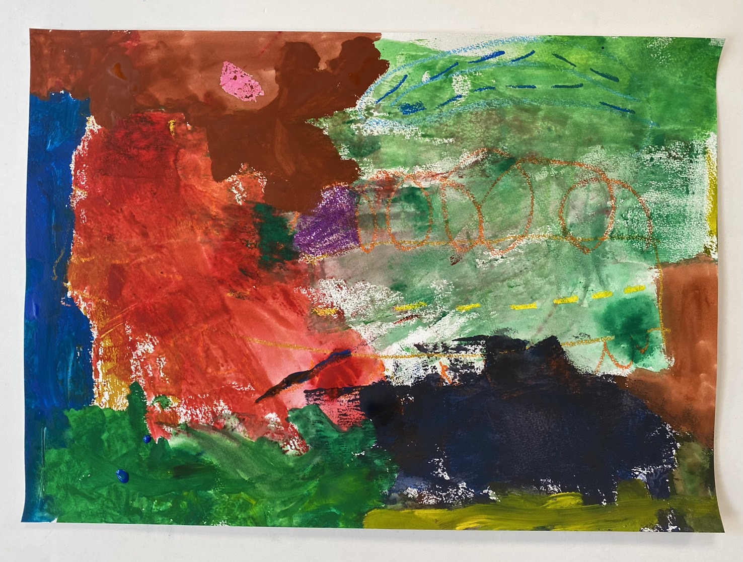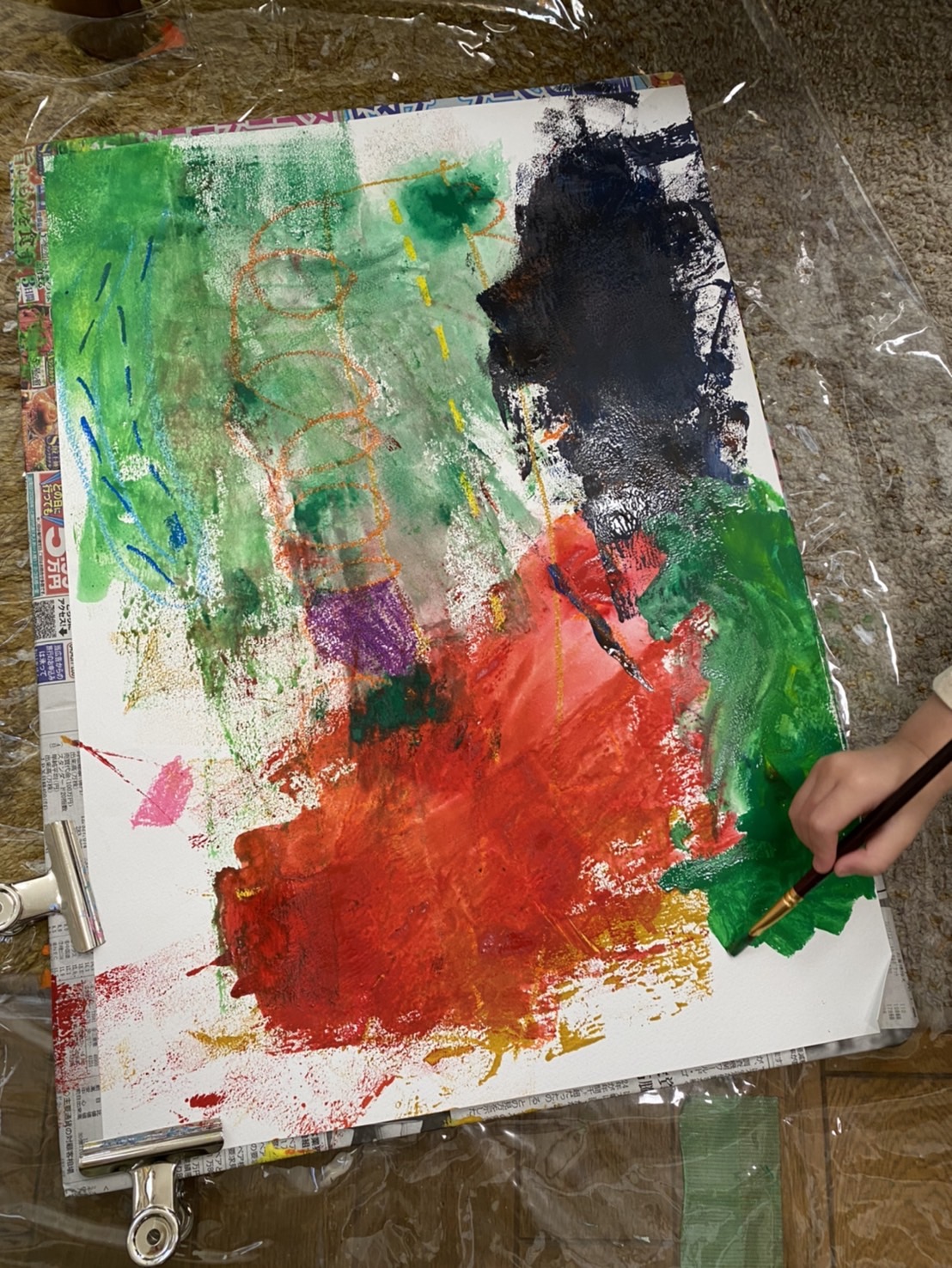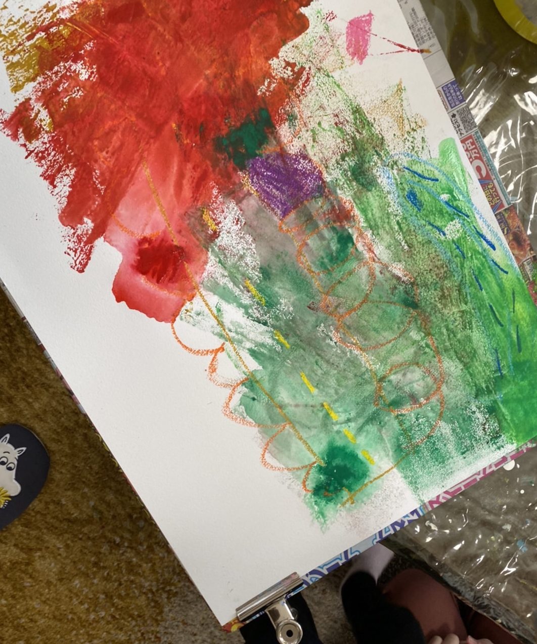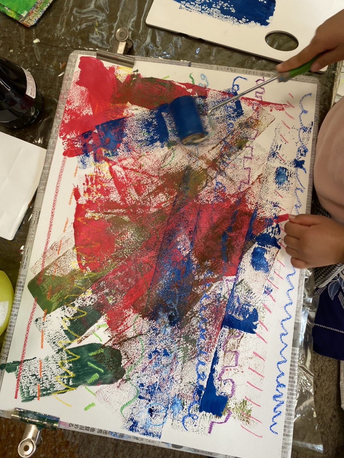 また、くるくるした線も大きくのびやかに描いていました。絵の具で色を塗るときはローラーを使って塗ったり筆も使ったり、元気よくし色を塗っていましたね!