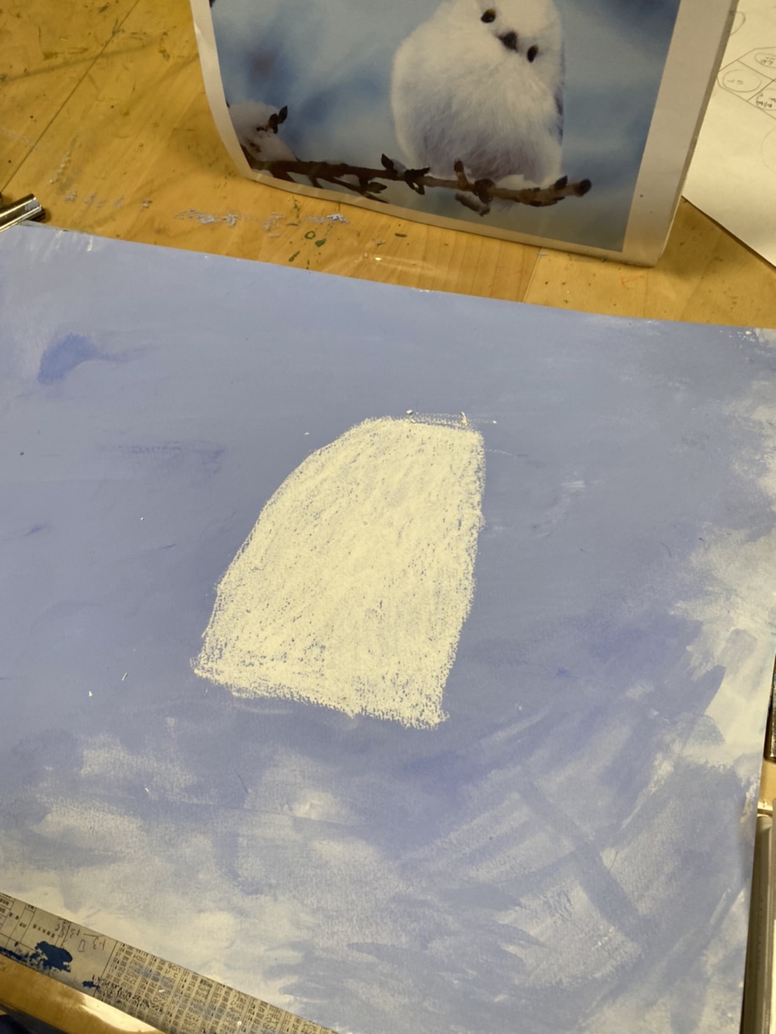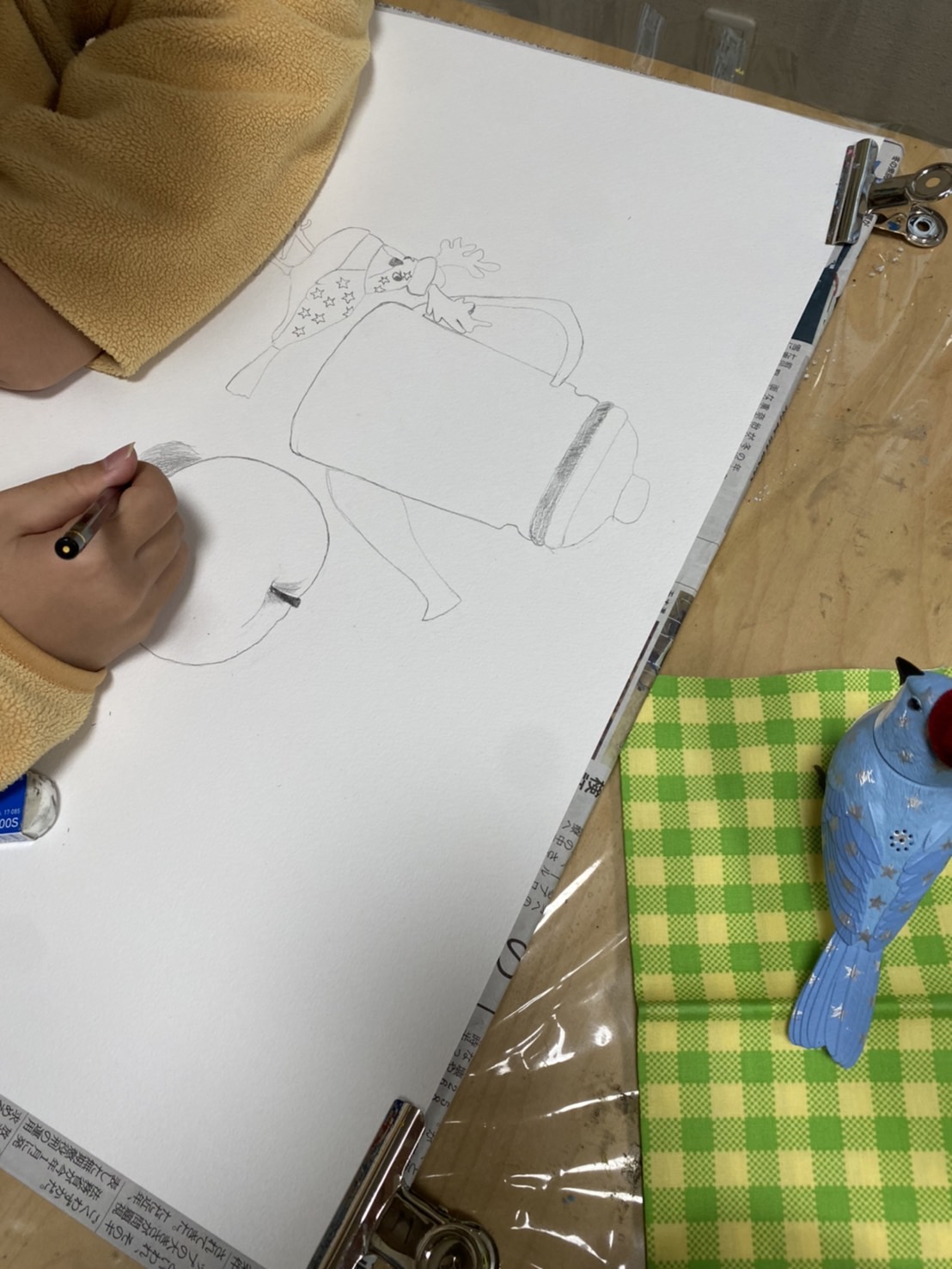 シマエナガの絵は、まずは画用紙を空間の色で全体を塗りました。それからクレパスで、毛並みに沿ってしっかり白くボリュームを持ちながらシマエナガのフォルムを作っています。そして、しずくちゃんは、シマエナガの下地の乾燥を待つ間に、鉛筆と色鉛筆で描いていました。主役を大きく描いて笑顔もかわいいです!