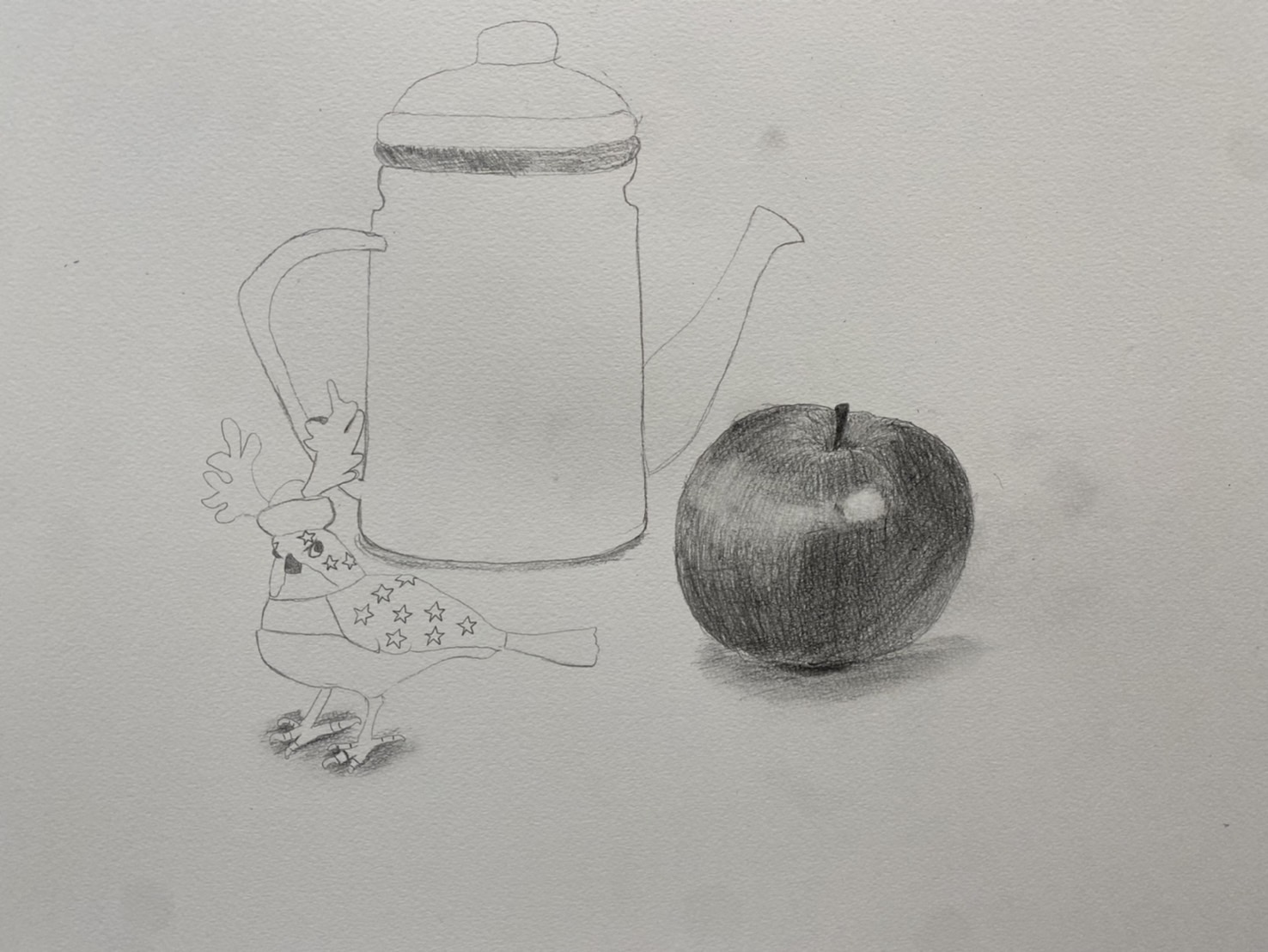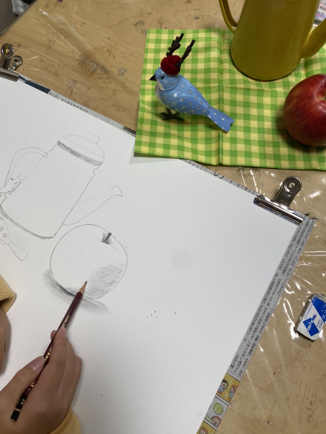 鉛筆で絵を描きたいとのことで、りんごをしっかりデッサンしました。鉛筆の重ね方も直線を面に沿って描いています。