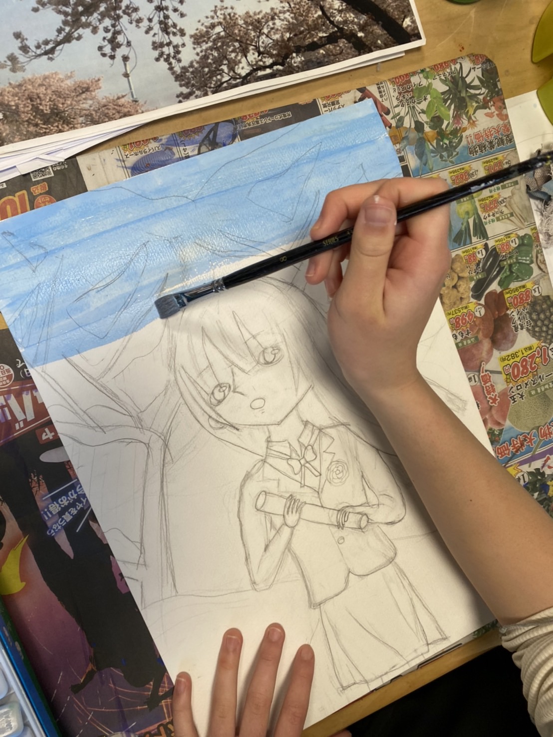 背景から空の色をベースに着彩して、その上に個々の色を重ねて描くとの流れで描いていくとのことで、着彩の流れもしっかりイメージして進めています。