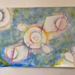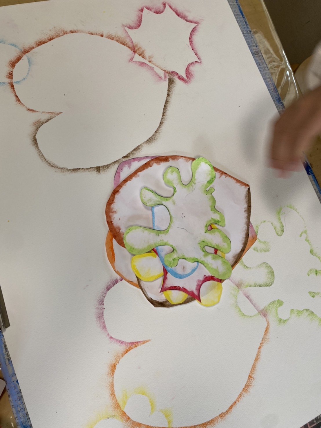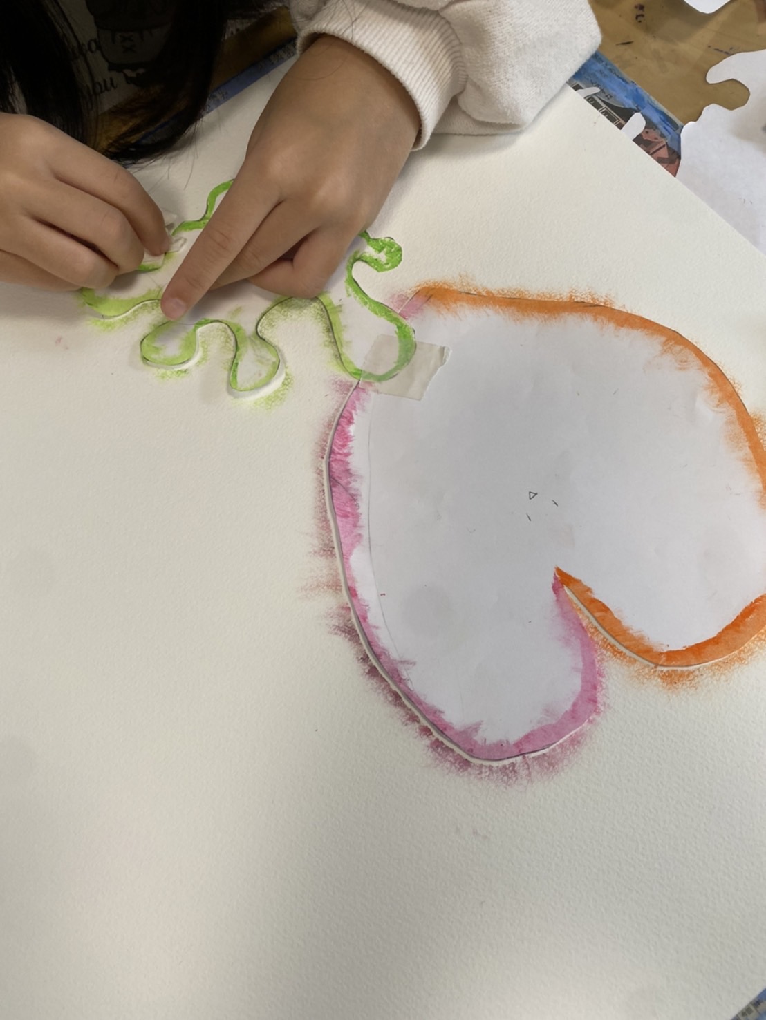 そして、クレパス画は、きもちをテーマに形や色を決めて進めていました。