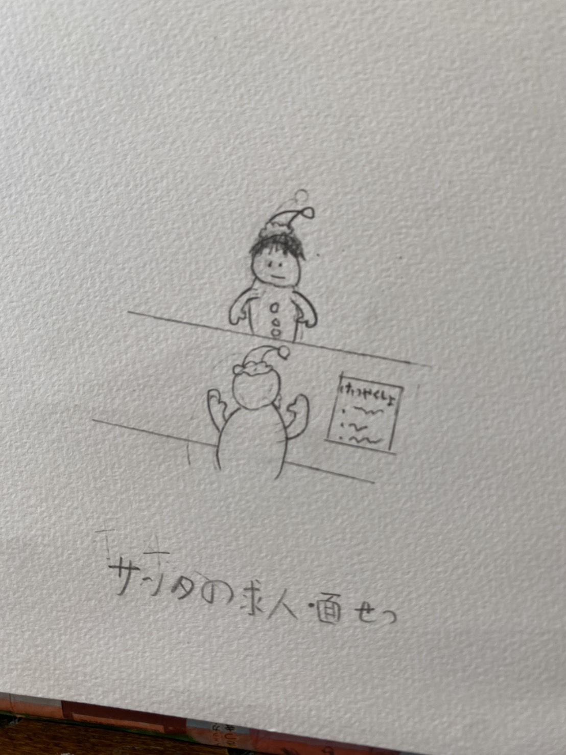 そして、サンタクロースの絵は、面接の項目を描きました。面接に来る新人サンタクロースはどんな感じがいいかなーとよく想像を膨らませてます。