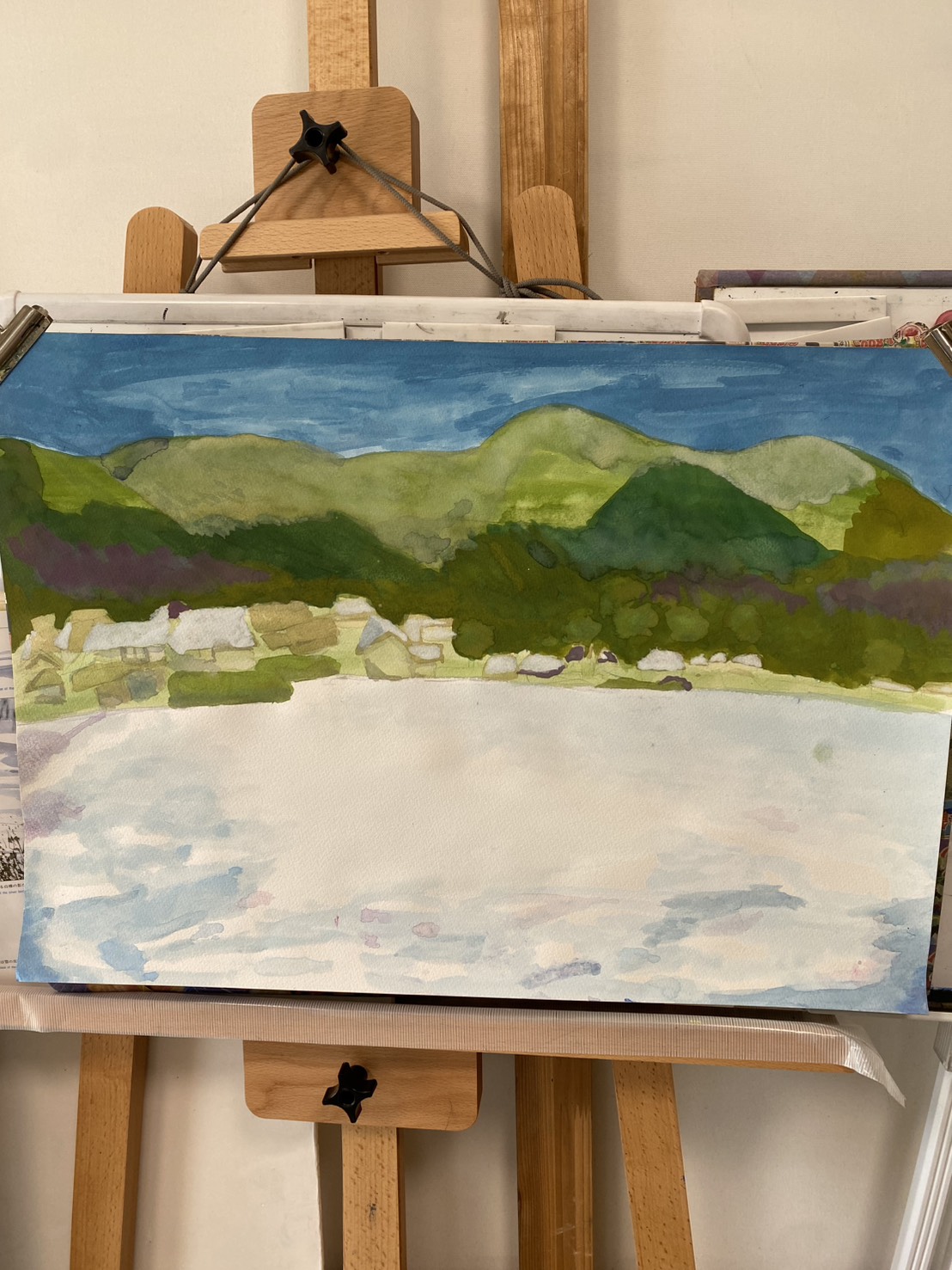 絵画全体的に青味が強いので、もう少し色幅を付けてもいいかと思いますので、紫味を重ねて色の深さが出てきました。