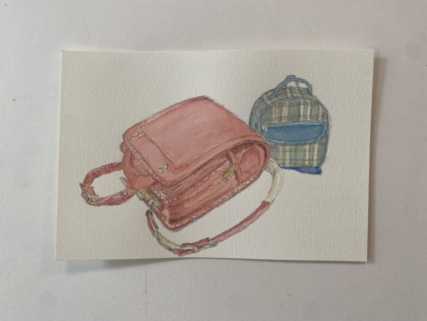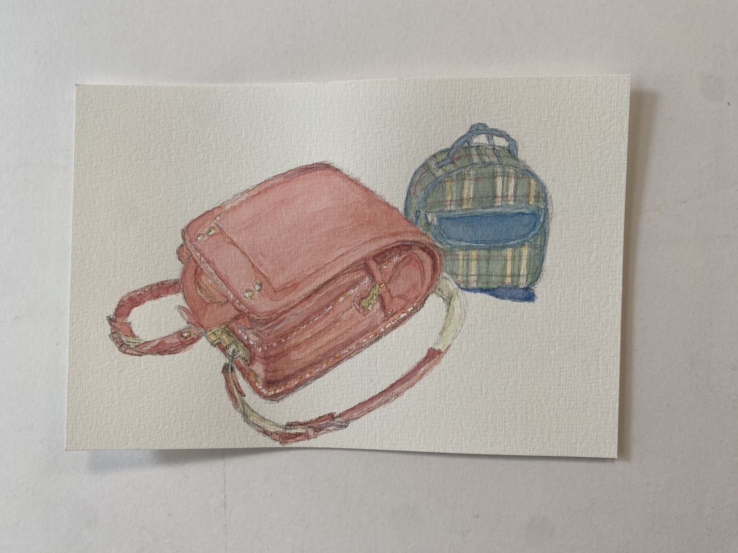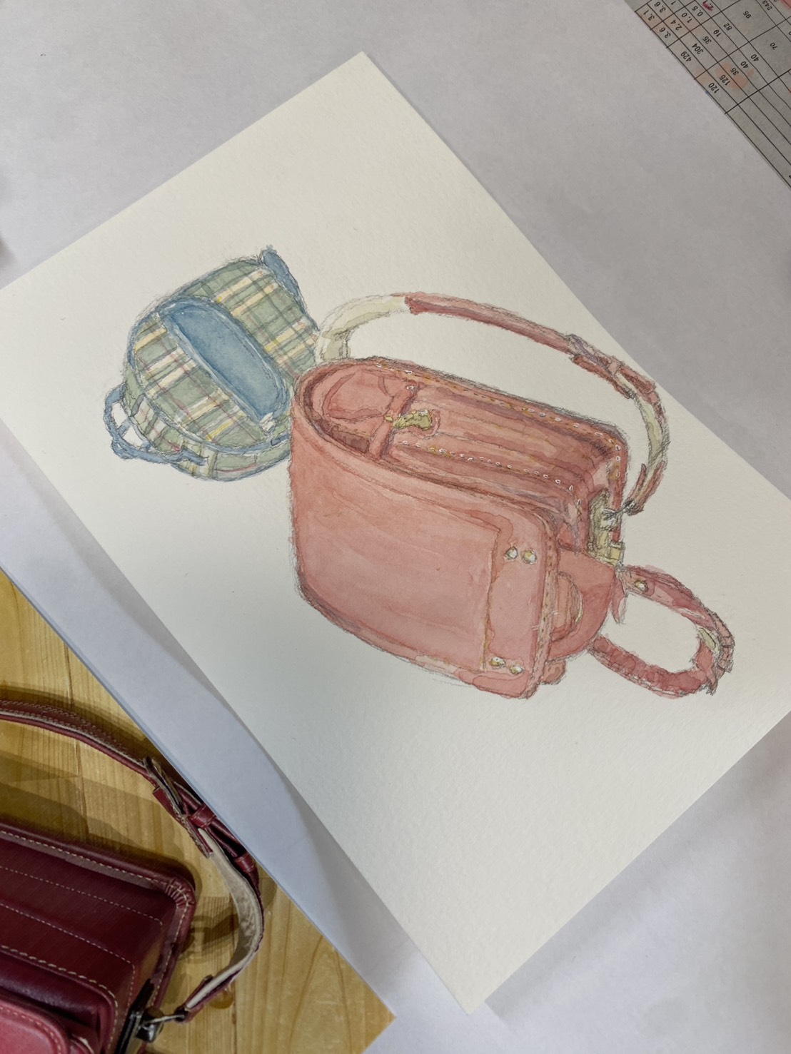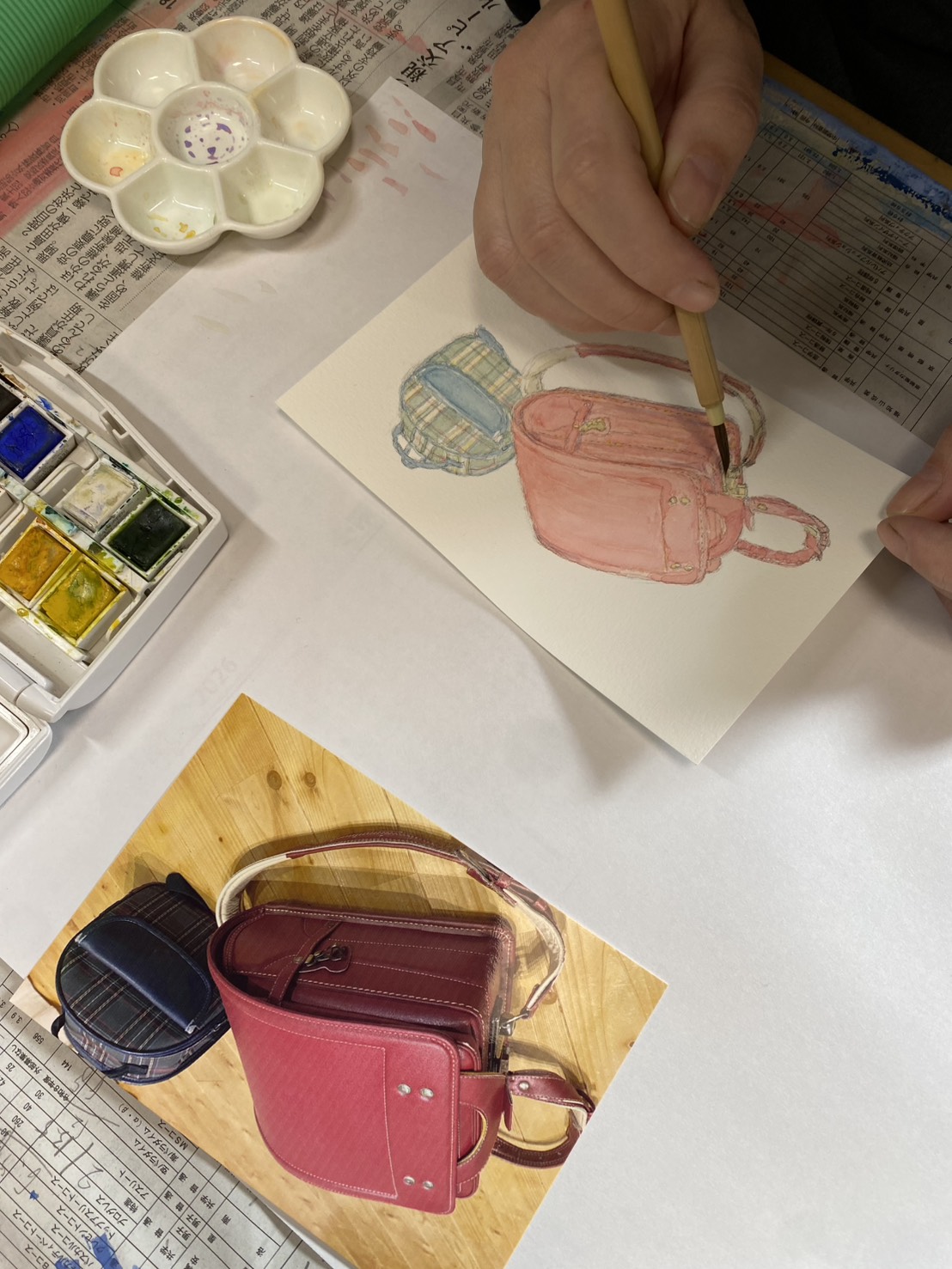 月一成人クラスでは、ランドセルの水彩画を行いました。