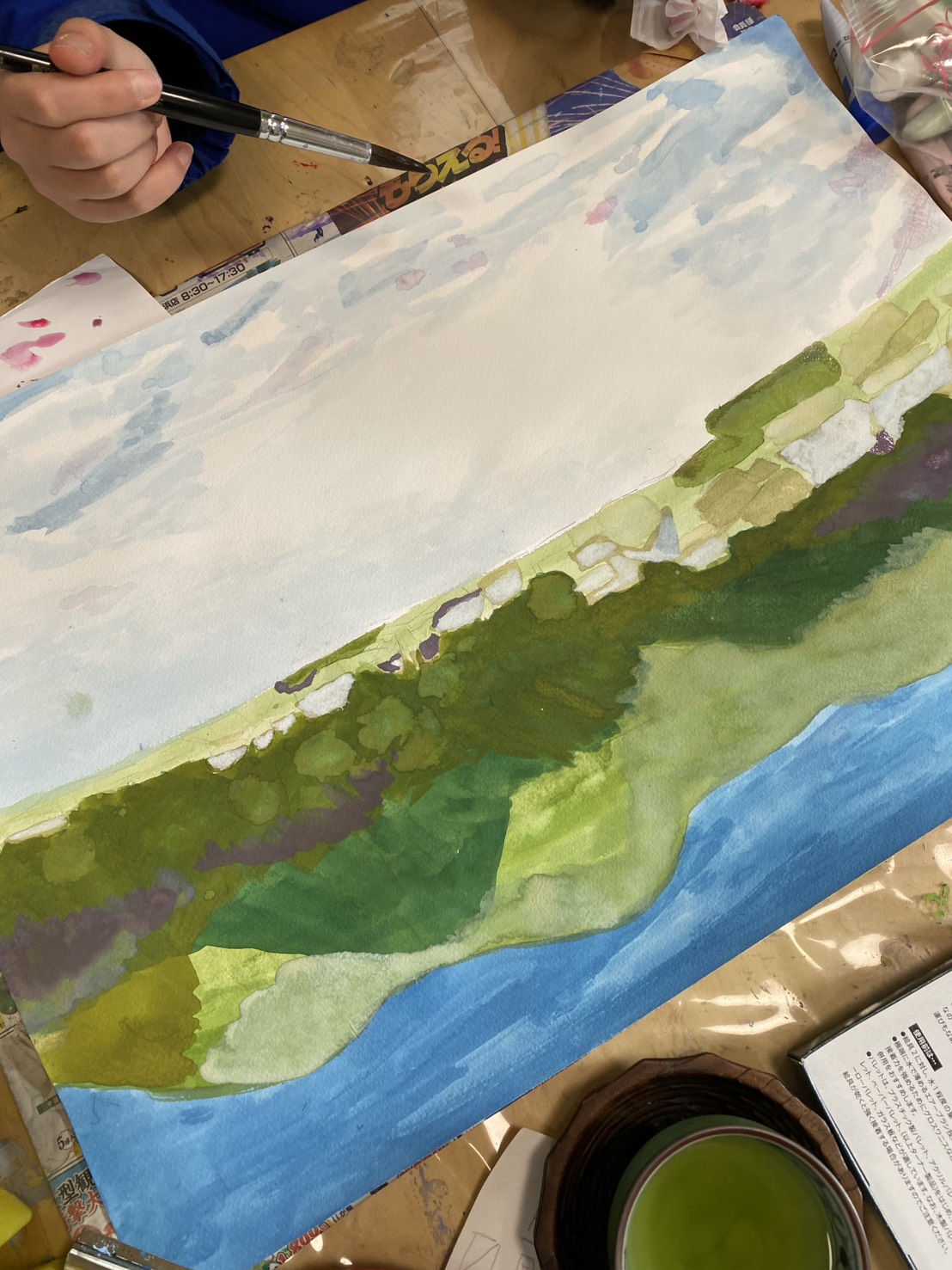 こんにちは、2026年3月14日 土曜日(朝)クラスでは、月一成人クラス、風景画、サンタクロースの絵を行いました。