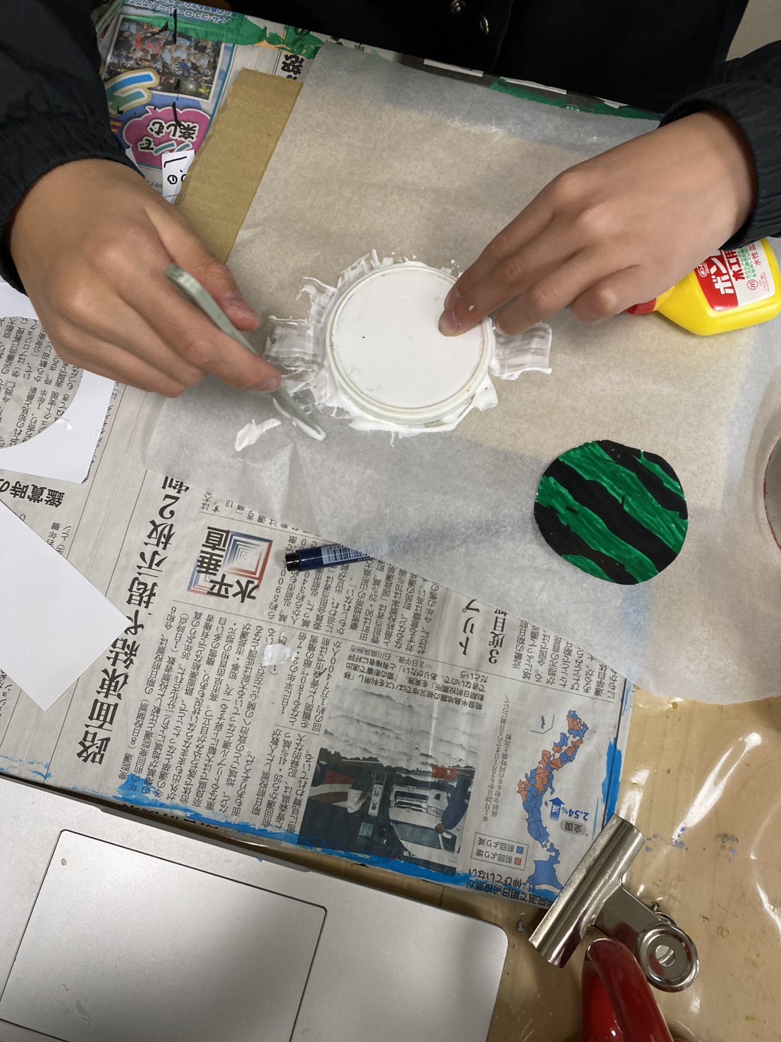 そしてシール作りもしました。オリジナルシール作りでは、あるもので立体的なシールを作るにはどうしたらいいか、考えて色々実験してみました。