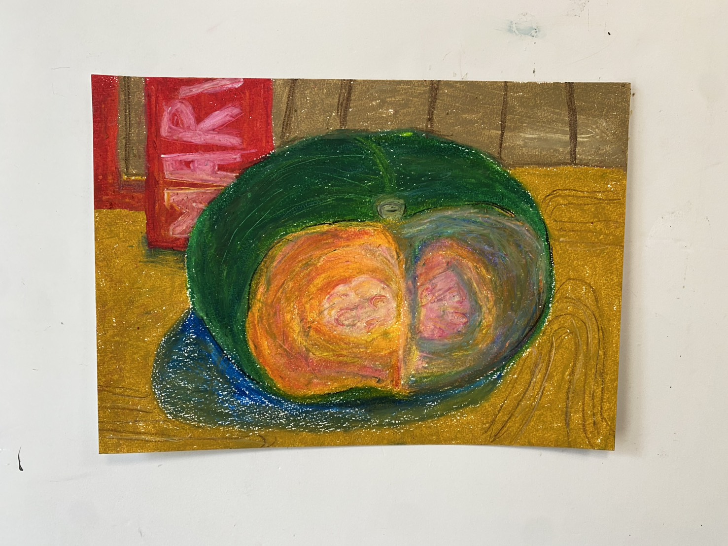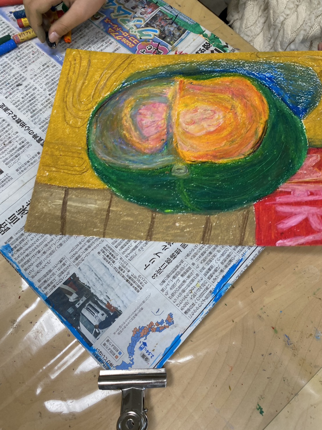そして、かぼちゃのモチーフを見てかぼちゃの見え方を注意してクレパスで描いています。