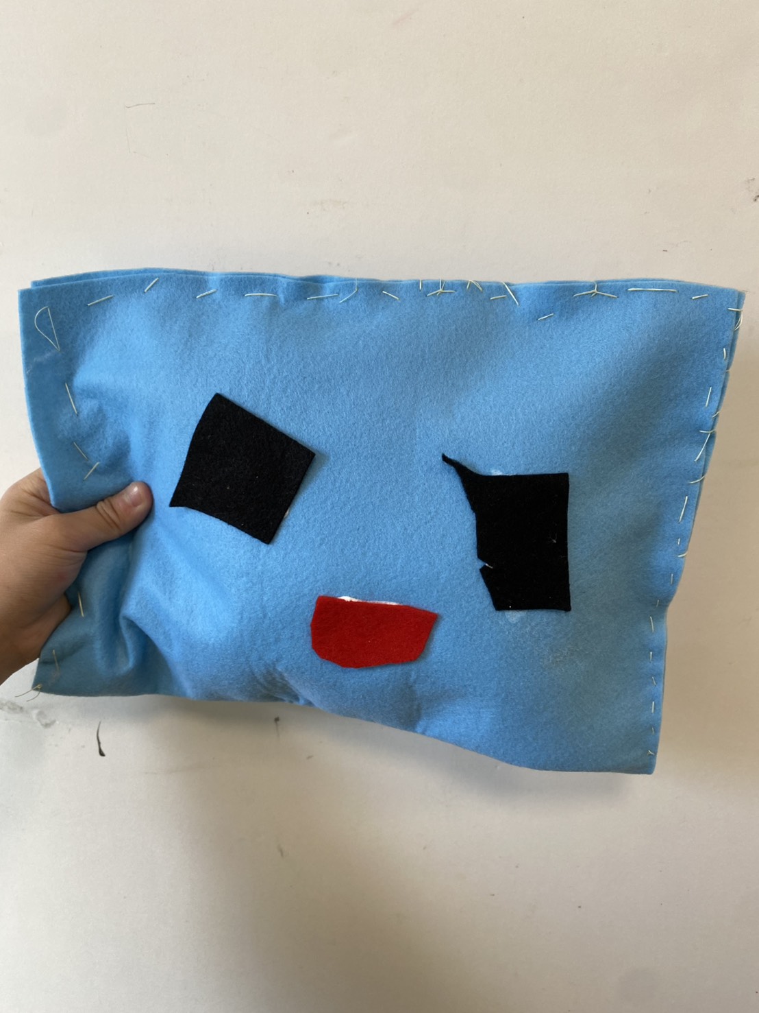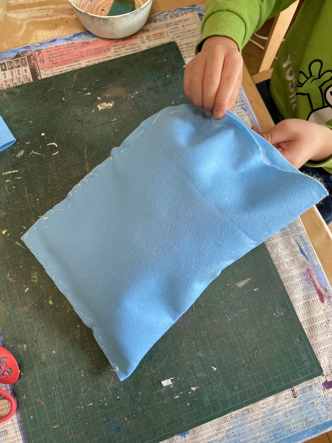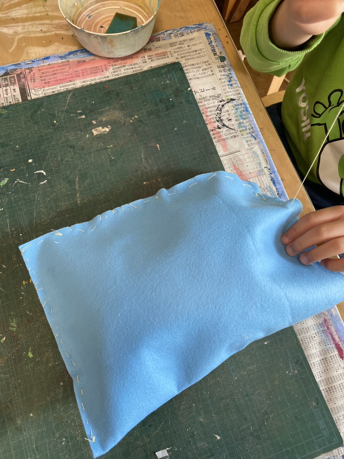 クッション作りは、フェルトを縫って綿を詰めてフカフカのクッションを作りました。