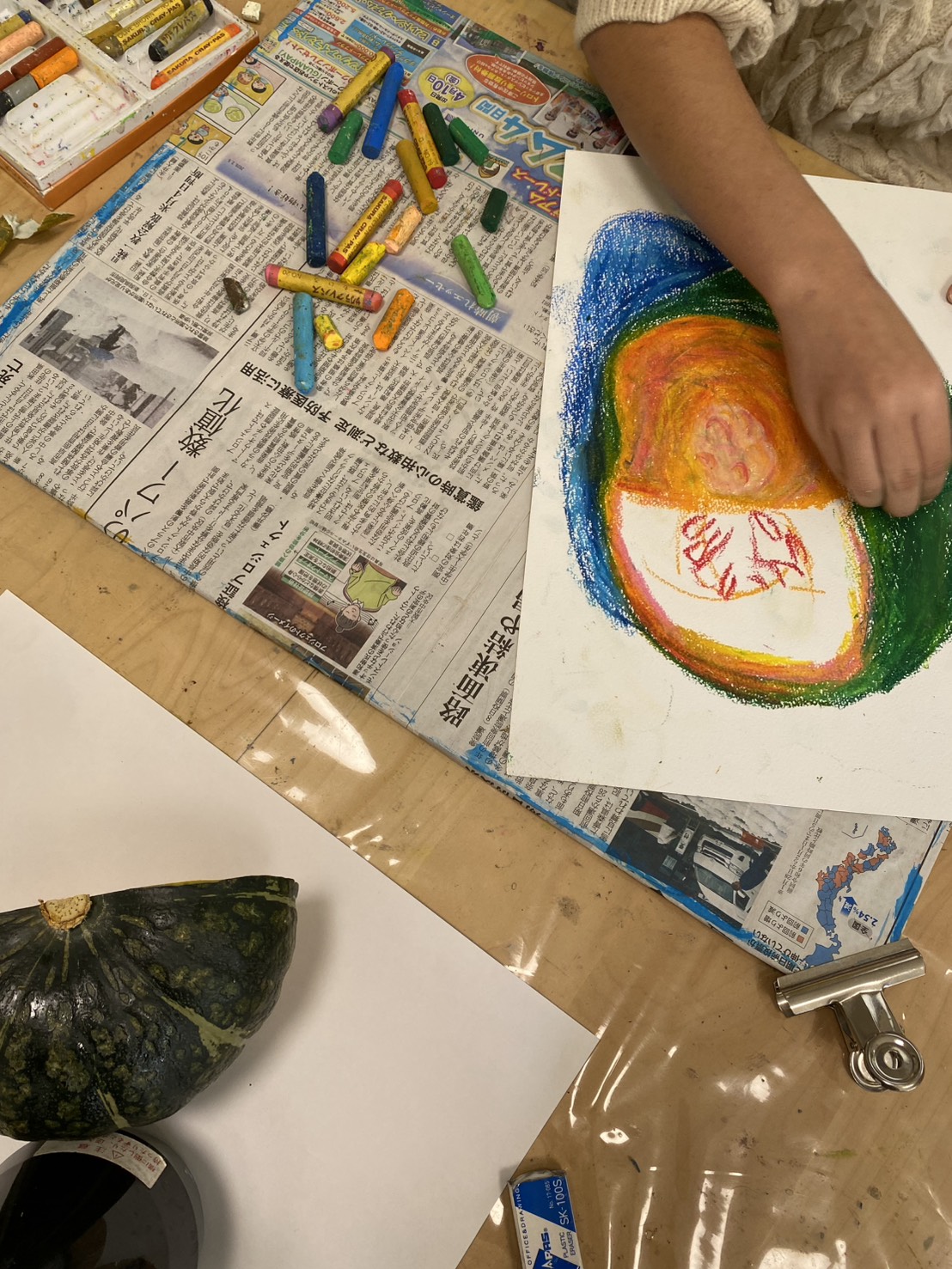 こんにちは、2026年3月14日 土曜日(午前)クラスでは、クッション作り、かぼちゃのクレパス画を行いました。