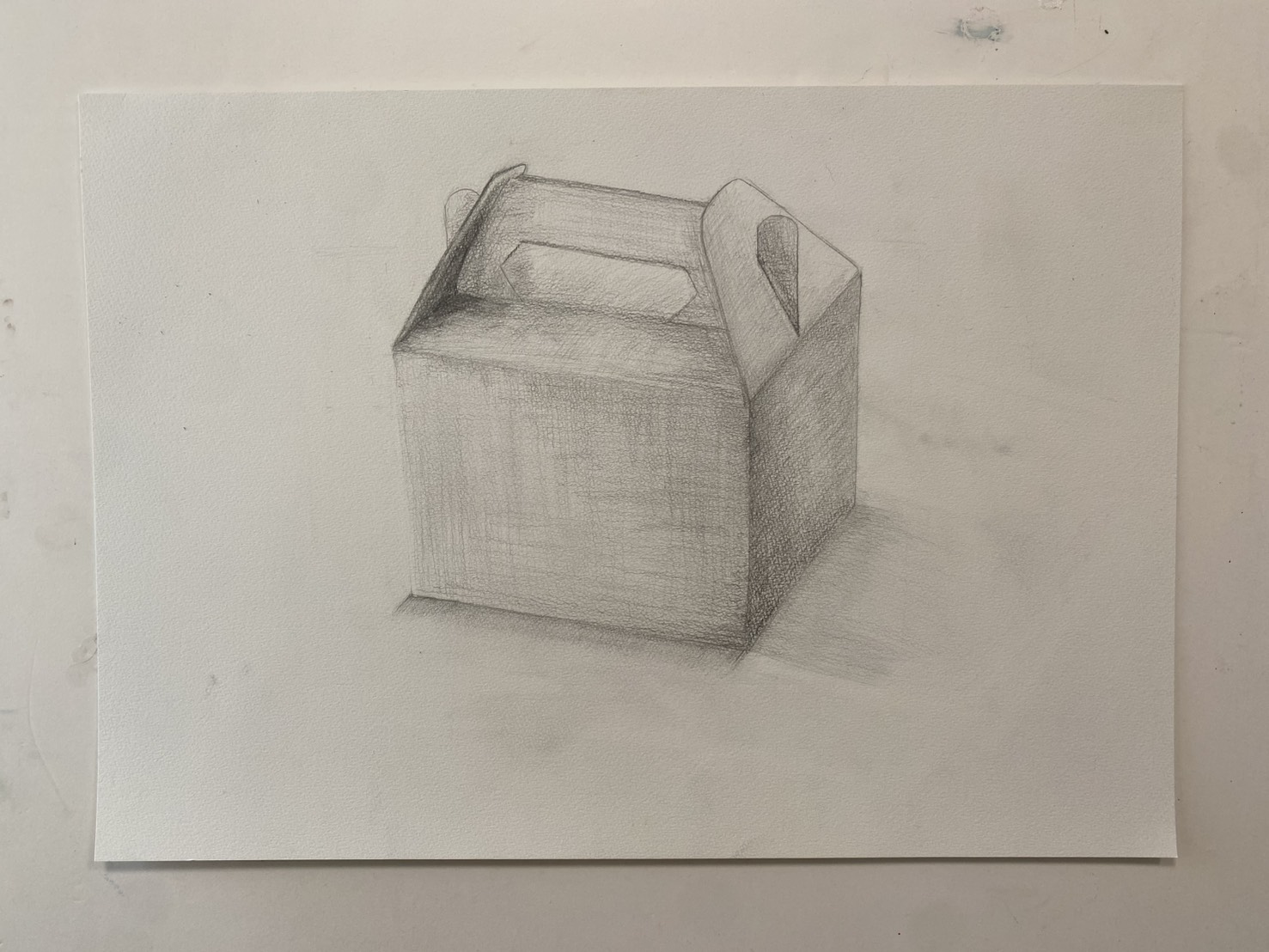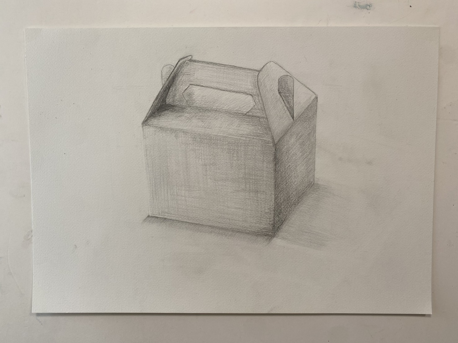 鉛筆デッサンは、明るいところの面は画用紙の余白の白と比較するとことも大事です。箱はものとして存在していますので、タッチを入れて存在感を引き出し、その面が光が当たり色が明るいのであれば、ねりゴムなどでタッチを押さえて色を引いてあげるなどの過程を重ねてあげるといいと思います。