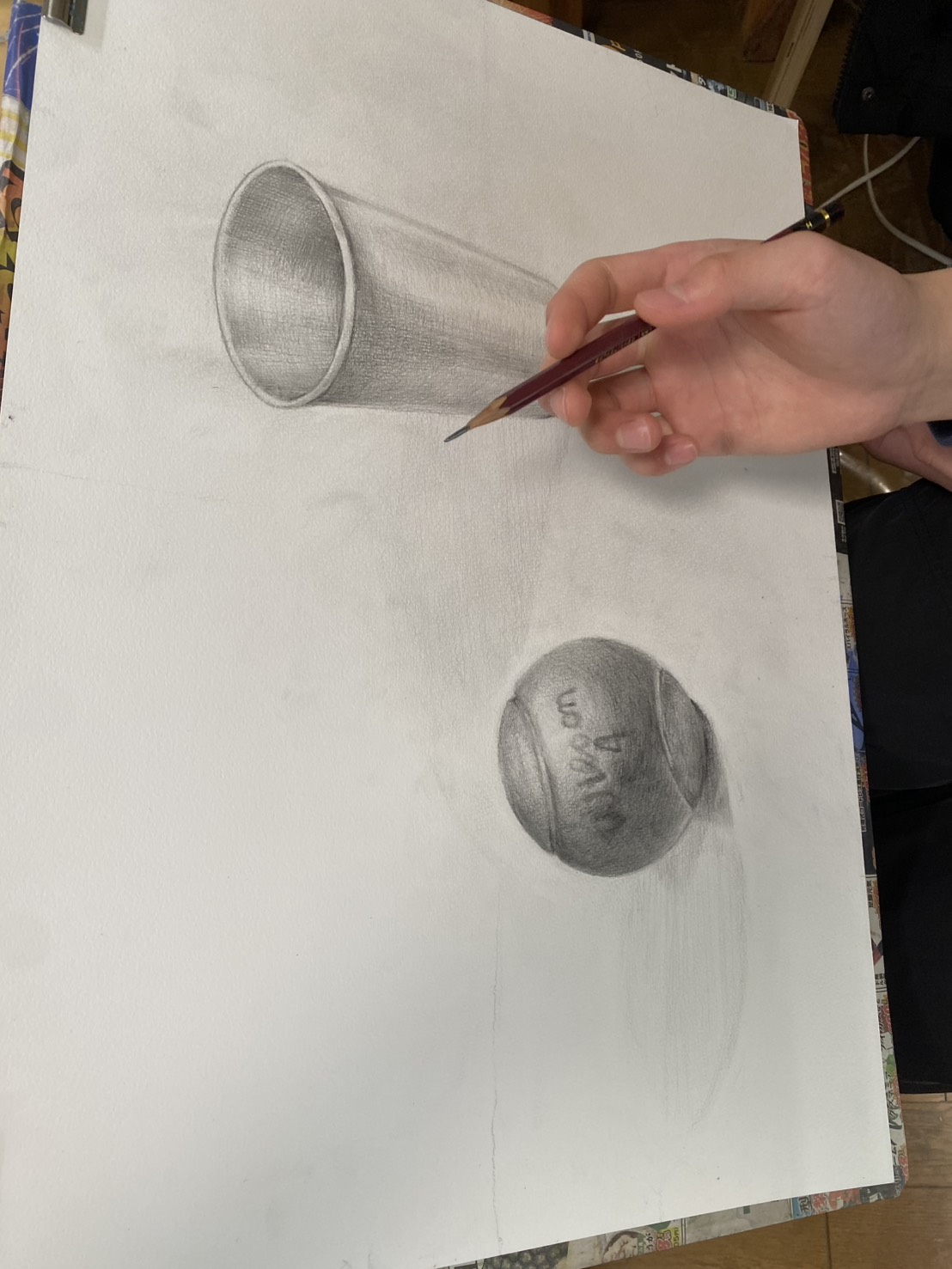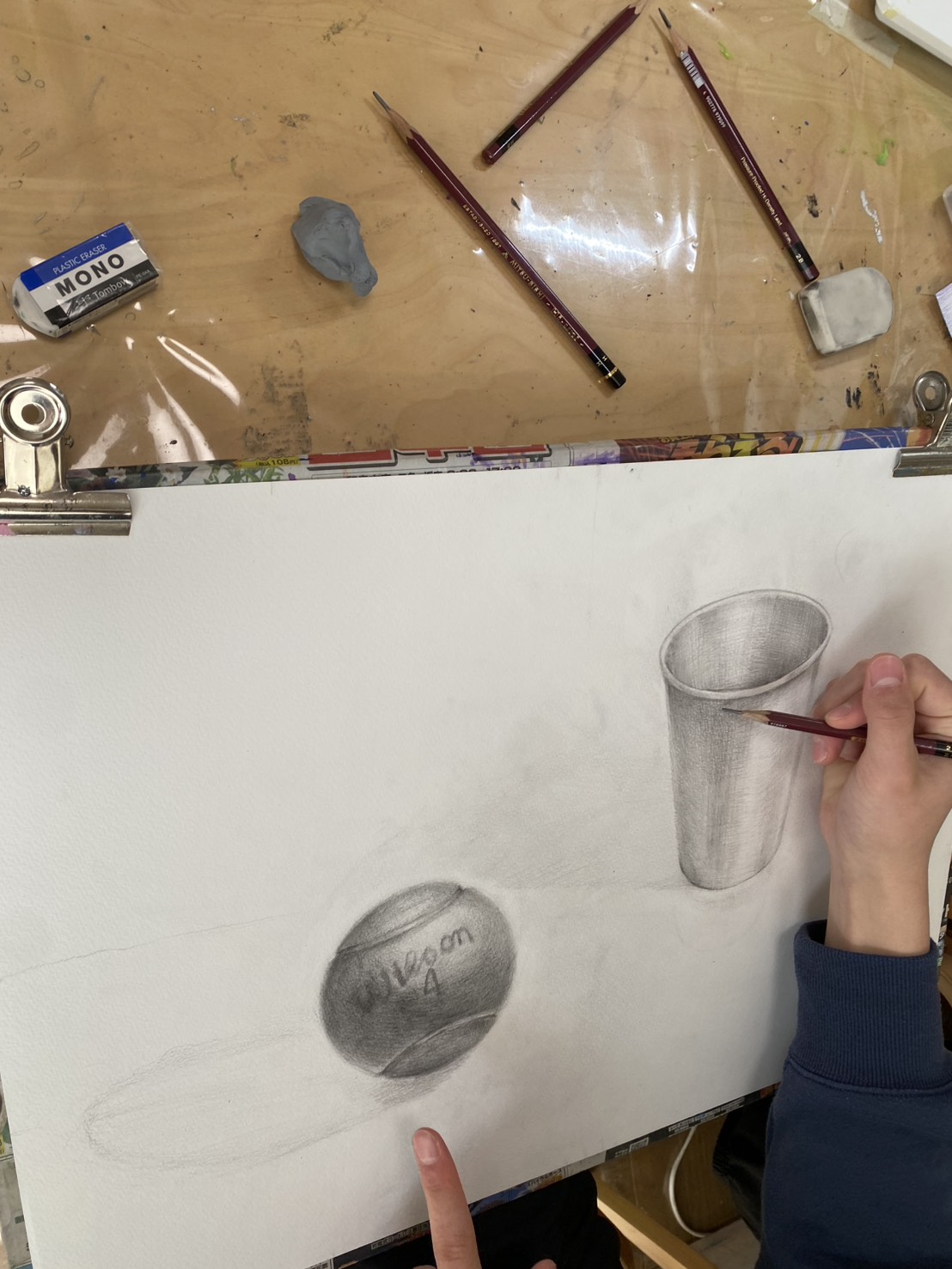 そして、静物デッサンは、テニスボールの細かな部分、線、レタリングなど、立体感を出した上にどのようにバランスを取りながら描くが大事なところですね。また、接地面をもう一度確認しましょう。地面とボールの間の濃く見えているところの範囲はそれでよいのか、描き過ぎていないか、空間の見え方につながってくるところです。