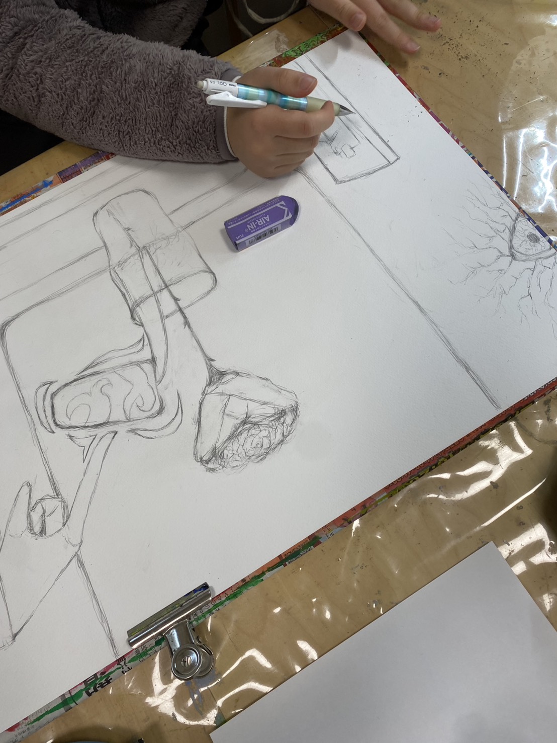 また、画用紙の左右上下の構成をよく取り組んでいました。手や、目、そして、イスなどのちょっとした動きも出してよく見てそれぞれのバランスを取っているように感じます。
