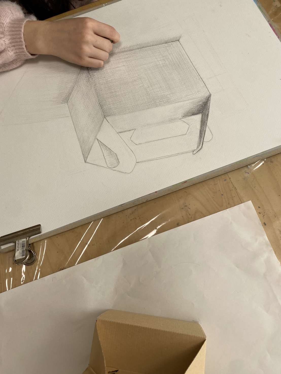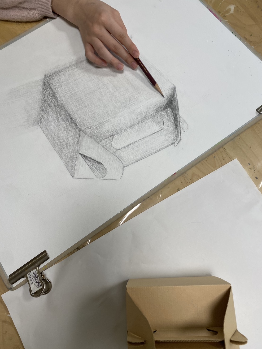 箱のデッサンは、箱の3面の明暗を確認して、箱の面を作り立体感ををまず作ることを意識して進め、そこから影や光の細かな見え方を描いていきました。
