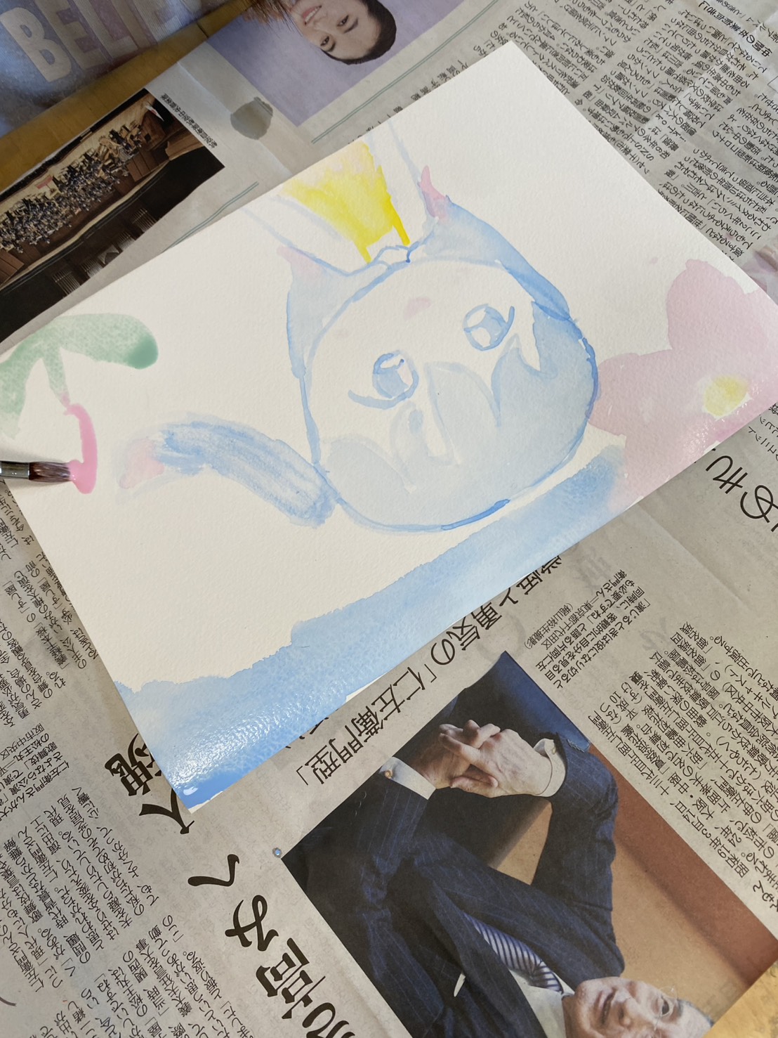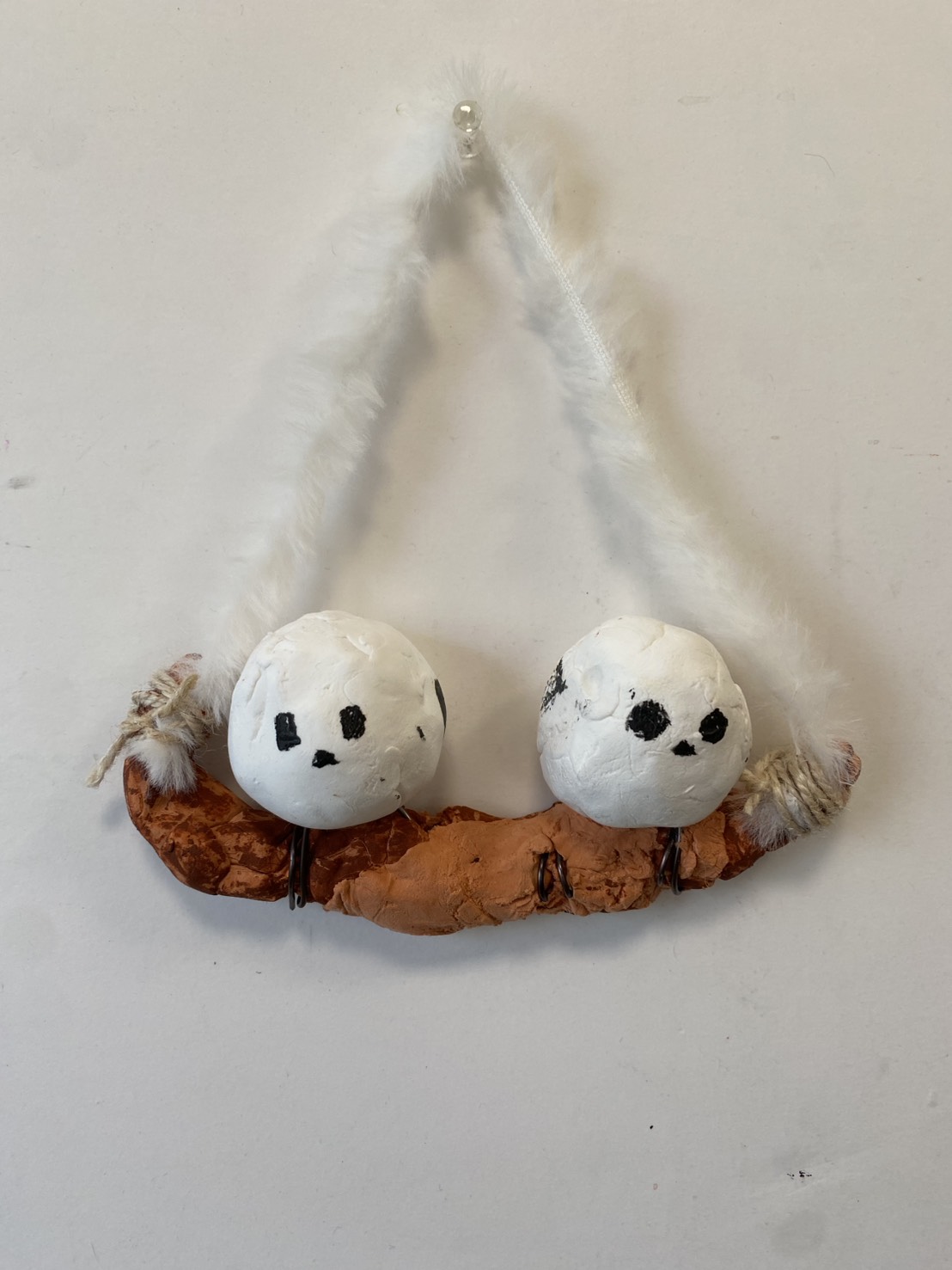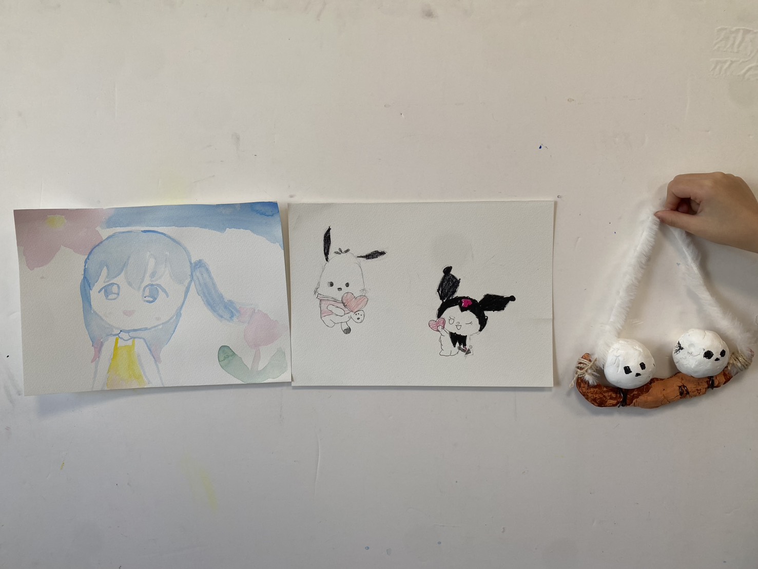 そして、にじみ絵、キャラクターの絵を描きました。その前に、前回作ったシマエナガの立体ですが、ねんどがしっかり乾いたら、シマエナガが上下ひっくり返ることなくぶら下げることが出来ました!ということで、かわいいシマエナガの立体が完成!