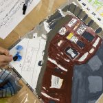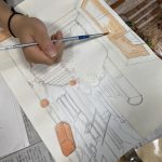 Mをバッグにどのように配置するか考え、下描きをし、下描きのMの形をはさみで切り抜き、切り抜いた周りの紙をバッグに貼り付けていきます。