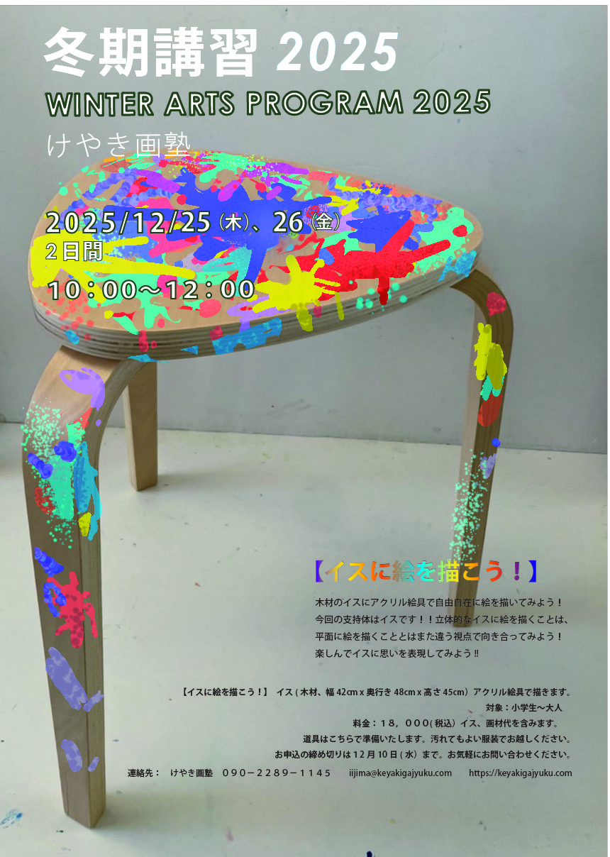 持ち物:手ぶらOK。汚れても良い服装で起こし下さい。最終日にイスをお持ち帰りください。
